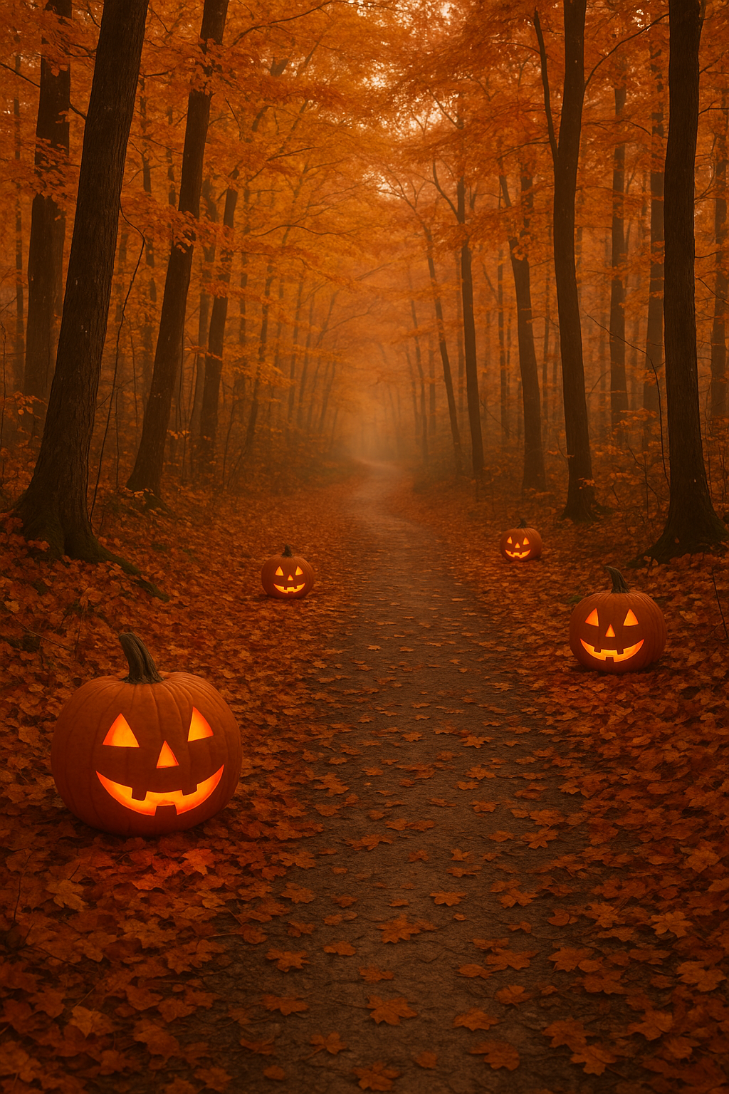 The image features a picturesque autumn filled with warm shades of orange and gold leaves. A narrow path leads deeper into the forest. The trees are surrounded by falling leaves that create a rich carpet on the ground. Along the path, several pumpkins with painted faces are placed, each glowing from within—creating a mysterious and welcoming atmosphere characteristic of Halloween. The fog enveloping the forest in the distance adds mystique and magic to this scene.