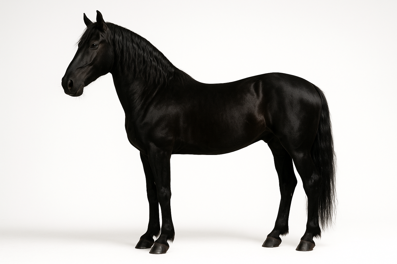 The image captures a black horse standing against a white background. The animal displays a slender body and shiny coat. Its mane is long and wavy, giving the horse an impressive appearance. The horse is looking to the side, its expression calm and confident. Note the details, such as the shape of its head and musculature, which highlight its strength and beauty.