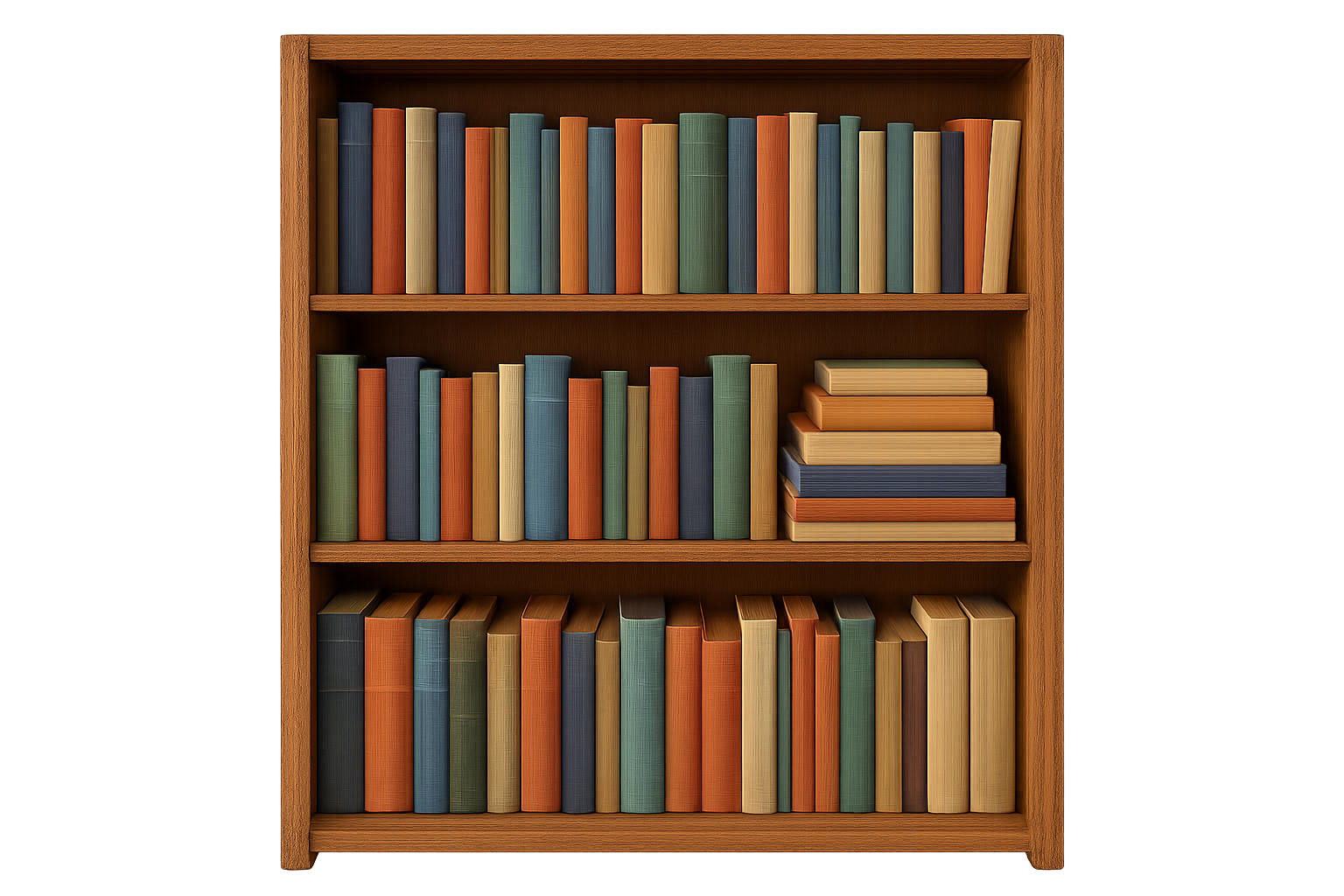 The image shows a wooden shelf filled with various books. The books are neatly arranged on four shelves, forming a harmonious composition. Each row includes books of different formats and colors, adding visual interest. The cover colors range from pastel tones to brighter shades, creating contrast and drawing attention. This shelf can be an excellent decorative element for a library, office, or living space.