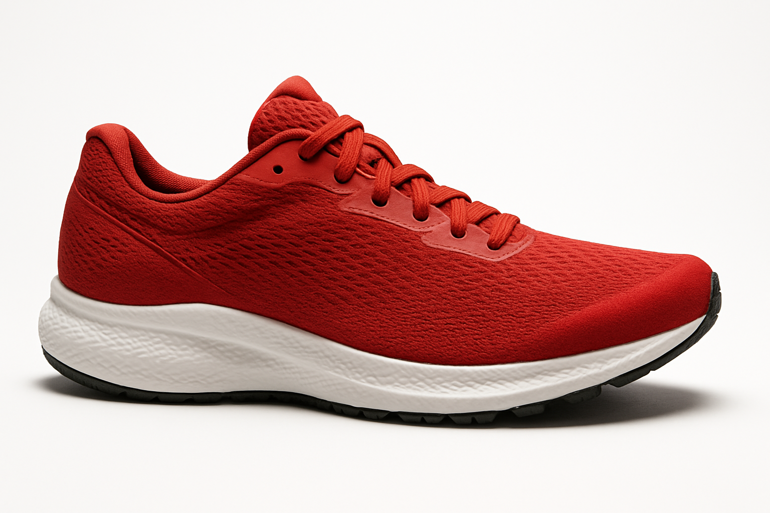 The image features stylish red sneakers that are perfect for sports and active leisure. These sneakers have a modern design with a textured upper made from breathable materials, ensuring comfort and good ventilation. The white sole contrasts with the vibrant color of the shoes, giving them an attractive look.