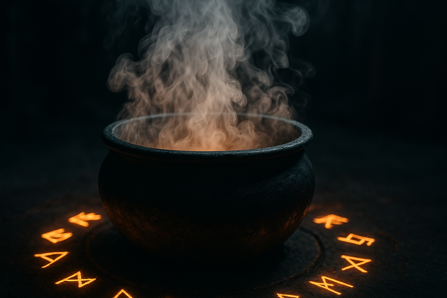 The image features a black cauldron from which thick steam rises, creating an atmosphere of mystery and magic. The cauldron is placed on a dark surface, and around it are glowing rune symbols in warm orange. These symbols can be interpreted as magical signs that add an air of intrigue to the scene. The steam emanating from the cauldron has smooth and swirling shapes, creating an illusion of movement and transformation. The low-light setting enhances the mysterious effect and draws attention to the central object—the cauldron.