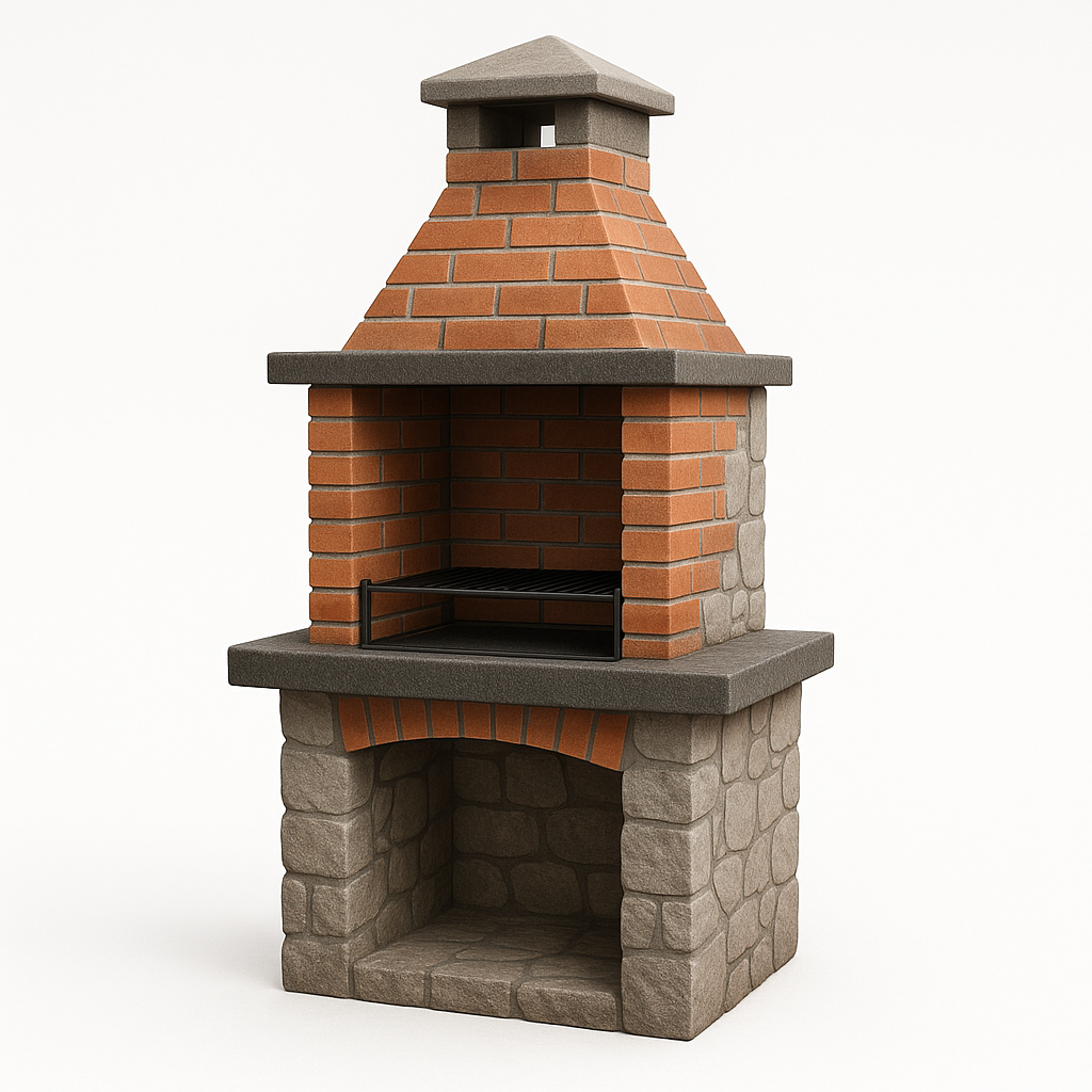 The image shows a classic brick barbecue that is perfect for country leisure and preparing barbecue. The barbecue is made of high-quality bricks in a characteristic red color and light stones. It features a spacious grill for meat and special ventilation holes at the top for better air flow.