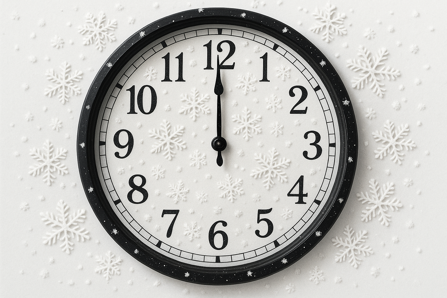 The image features a wall clock with a black rim set against a background decorated with white snowflakes. The clock has a classic white dial with black Arabic numerals and two-colored hands indicating the time. The snowflakes of various sizes create a winter atmosphere, emphasizing the season. The setting is executed in light tones, giving the image a sense of lightness and freshness.