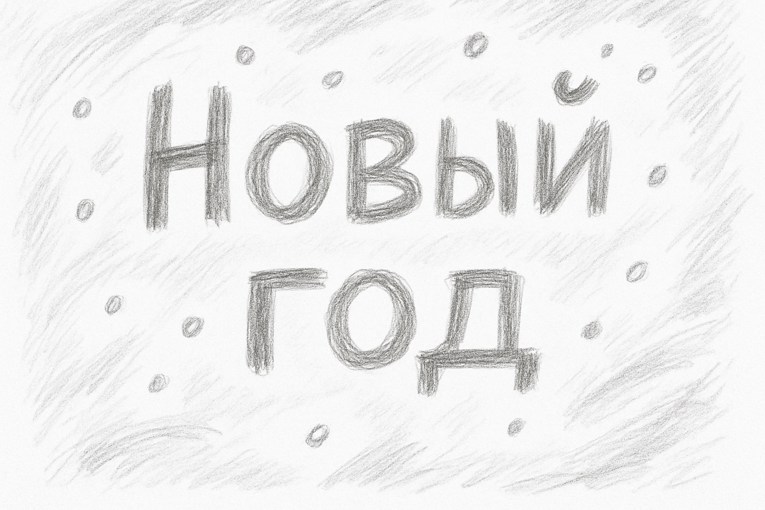 The image features a drawing done in gray pencil tones. At the center is a large inscription 'New Year', designed in a childlike style. The font appears informal with rounded letters. The background is white, with small gray dots and lines creating an effect of snow or a background pattern. This image is created in a pencil drawing technique, adding a sense of coziness and simplicity.
