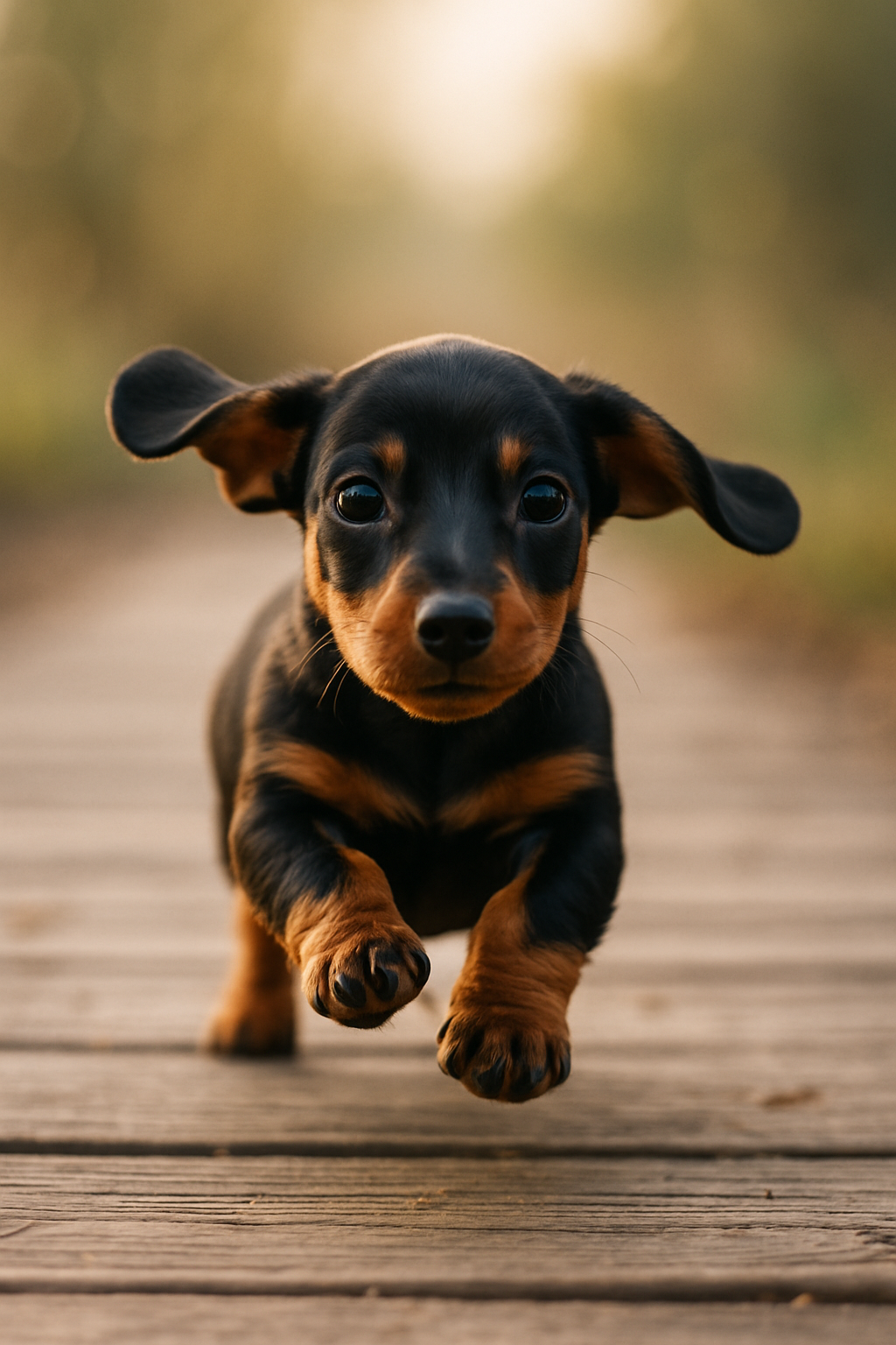 The image features a dachshund puppy energetically running along a wooden path. It has shiny, smooth fur predominantly black with reddish markings on its paws and chest. The puppy appears very playful and curious, with its ears flapping in the wind and eyes sparkling with excitement. The path is surrounded by a soft green background, creating a feeling of coziness and harmony with nature. The bright weather and gentle sunlight add a special charm to the scene, capturing a magical moment when the puppy enjoys freedom and play in the fresh air.