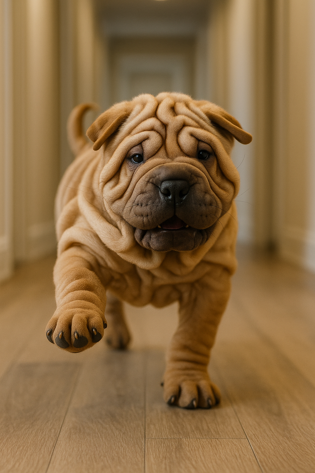 The image features an adorable Shar Pei puppy confidently striding down a long hallway. Its characteristic wrinkled skin and expressive eyes draw attention. The puppy appears full of energy and curiosity about the surrounding world. The hallway has light-colored walls and wooden flooring, creating a cozy and warm atmosphere. Gradually fading lines in the background add a sense of depth and scale.
