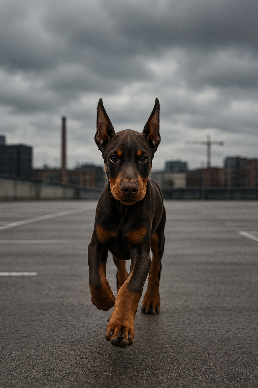The image shows a young Doberman running on an empty parking lot under a gloomy cloudy sky. The dog is in the center of the frame, highlighting its distinctive features: pointed ears, muscular body, and unusual coloring with reddish spots on its paws and chest. The background consists of urban buildings and industrial structures, adding to the urban atmosphere. The lighting conditions and composition create an unusual contrast between the living nature and the industrial environment.