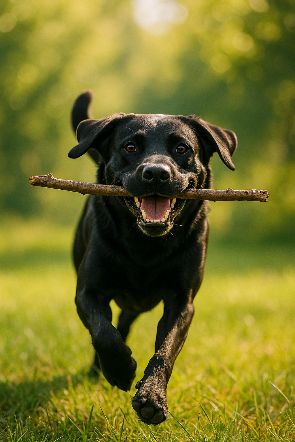 The image depicts a black Labrador Retriever joyfully running across a green meadow with a stick in its mouth. The background of the photograph is blurred, featuring soft light and shades of green, which creates an atmosphere of tranquility and playfulness. The dog appears happy and energetic, with its ears up and its tail wagging in delight. This image beautifully captures a moment of joyful play for the dog outdoors, highlighting its active and friendly nature.