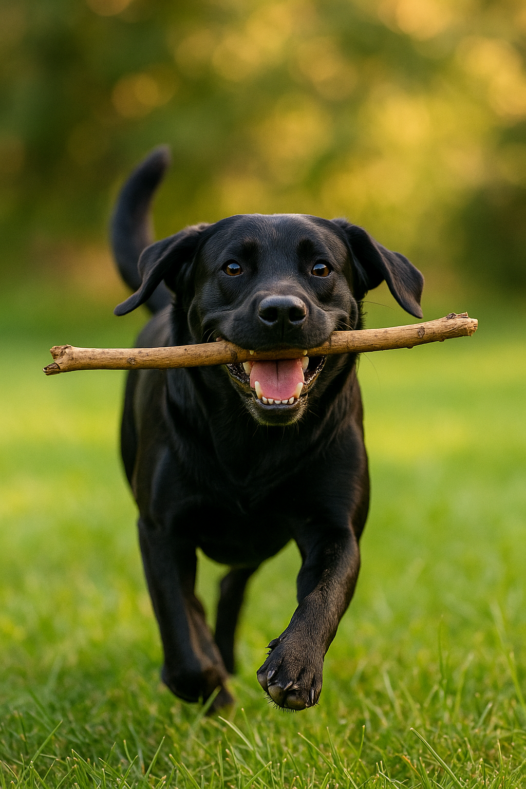The image shows a black Labrador dog joyfully carrying a stick in its mouth. The dog is running on a green lawn, and its face beams with a smile that reflects happiness and a playful mood. The background is blurred, creating a sense of depth and emphasizing the action. The green grass contrasts with the dog's black fur, while the blurred background vegetation gives the scene a warm, sunny appearance. Such moments are often encountered during walks with pets in parks or nature, where the dog can enjoy running and playing in the fresh air.