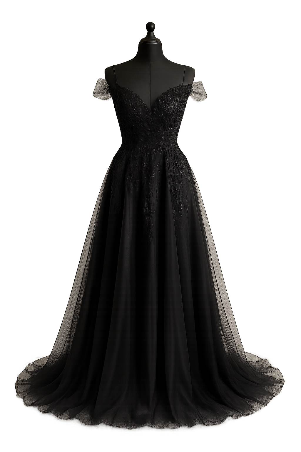 The image features an elegant black evening dress. The dress has a graceful silhouette and is made of delicate material. The upper part of the dress is adorned with fine lace, adding a romantic style. The sleeves are made of sheer chiffon, bringing lightness and airiness to the look. The skirt flows, creating a sense of motion even when still. The dress is displayed on a mannequin, accentuating its shape and structure. This type of dress is perfect for evening events, weddings, or other formal occasions where beauty and style are important. It combines both strict and romantic elements, making it a versatile choice for various events.