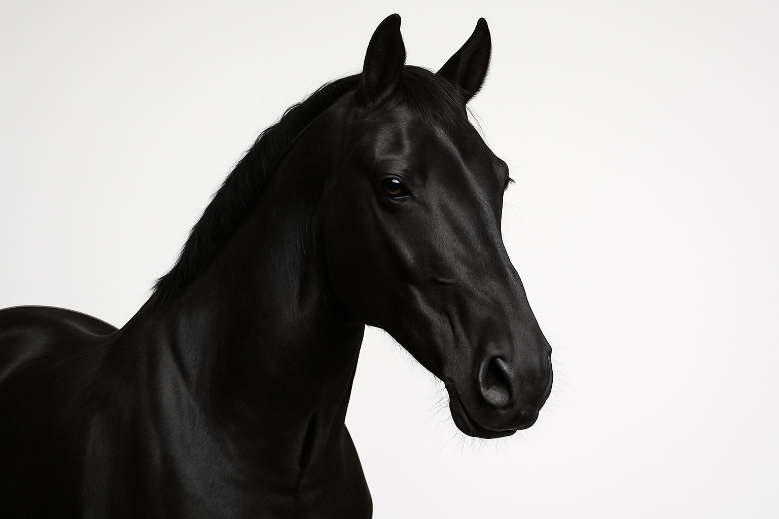 The image features a black horse with shiny coat captured against a light background. The horse is depicted in profile, highlighting its graceful lines and musculature. Large, expressive eyes and well-defined contours of the head create an impression of strength and nobility.