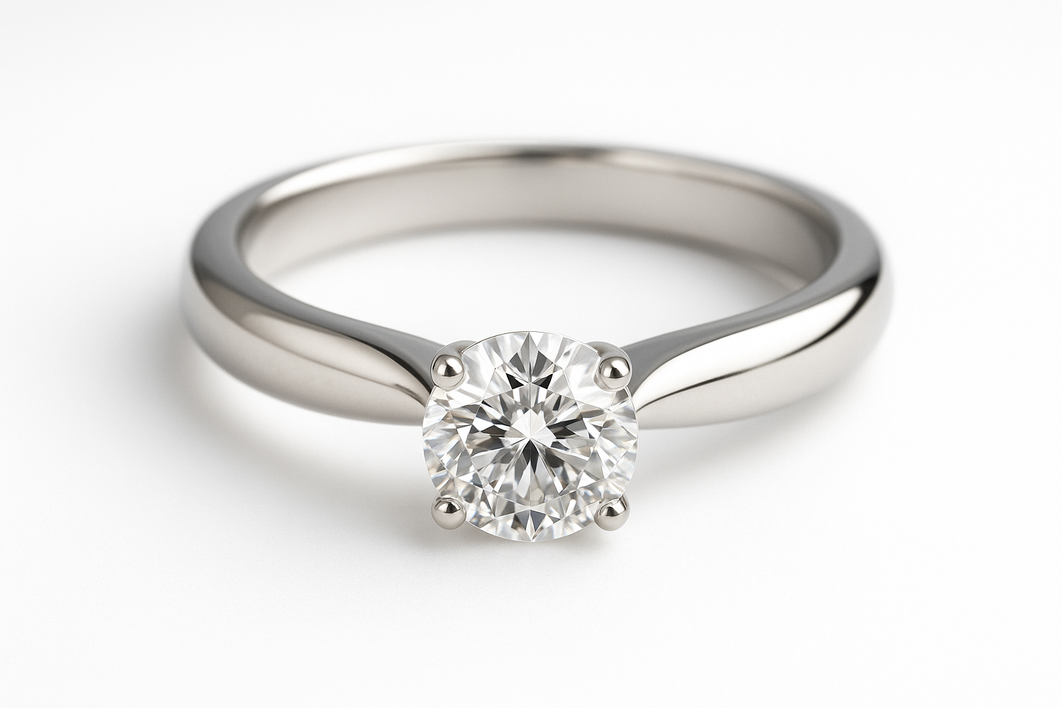 The image features an elegant engagement ring made of noble metal, with a central round diamond that sparkles in the light. The ring has a smooth, polished surface, giving it a stylish and modern look. The diamond, set in four prongs, effectively catches the light and creates an impressive sparkle. The simplicity and grace of the ring's design make it suitable for a romantic proposal or as a meaningful gift for other important occasions.