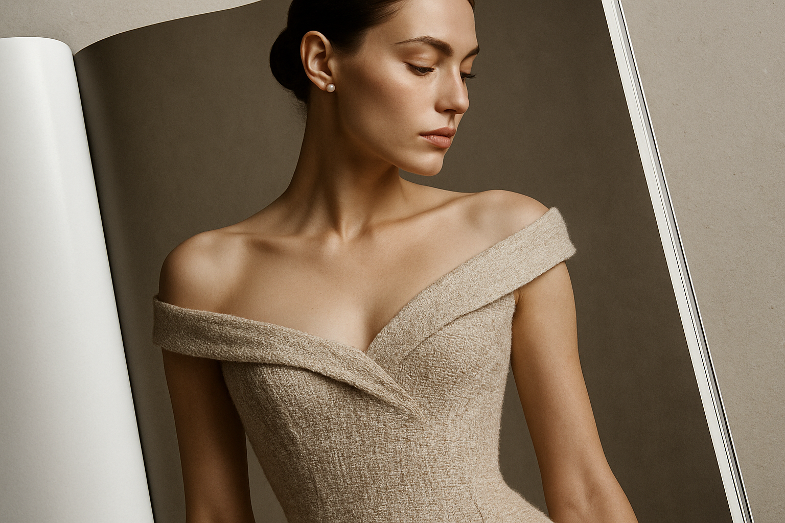 The image features a woman posing in a stylish off-shoulder dress. The dress is made of textured beige fabric that accentuates her figure. The background is soft and neutral, creating a sense of depth and drawing attention to both the model and the dress. The woman has a neat hairstyle, and her makeup is done in natural tones, further highlighting the elegance of her look. The off-shoulder style of the dress adds a touch of romance and sophistication. The photograph is in pastel shades, emphasizing the delicacy and refinement of the design. This image is perfect for illustrating fashion collections or evening wear styles.
