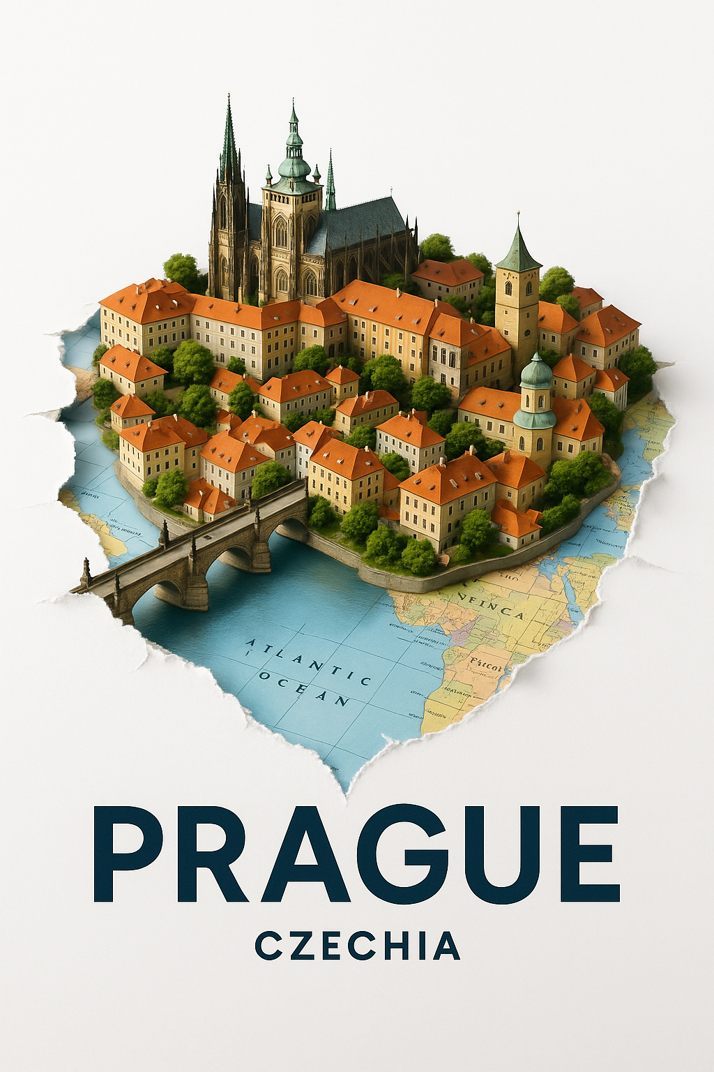 The image features a miniature model of Prague, the capital of the Czech Republic. The main highlight is the magnificent St. Vitus Cathedral, situated against the backdrop of red-roofed buildings. A bridge spanning the river connects different parts of the city, creating a harmonious and picturesque landscape. Green trees add a touch of natural charm, and a map of the region surrounds the scene, highlighting the geography of the city. This image beautifully illustrates the architectural features and historical significance of Prague, drawing attention to the cultural heritage of the Czech Republic.