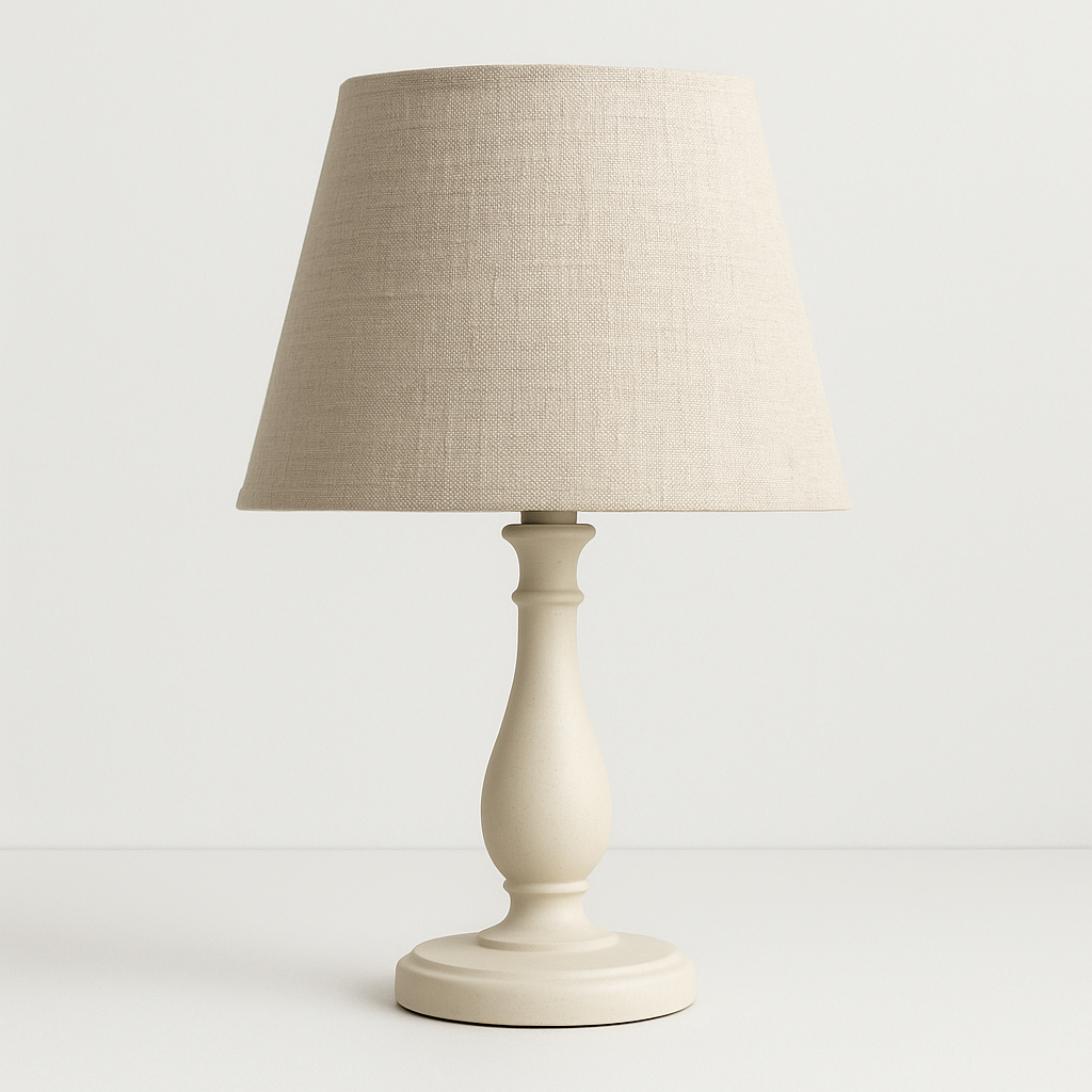 The image showcases a classic table lamp made in light tones. Its base, sculpted into an elegant shape, is painted in a light cream color, giving it a stylish and modern look. The lamp shade is made of textile, features a beige color and a rounded shape, making the fixture a soft and cozy element of decor. A light wall in the background emphasizes the simplicity and elegance of the lamp's design. This lamp will beautifully fit into various interiors, adding touches of warmth and style.