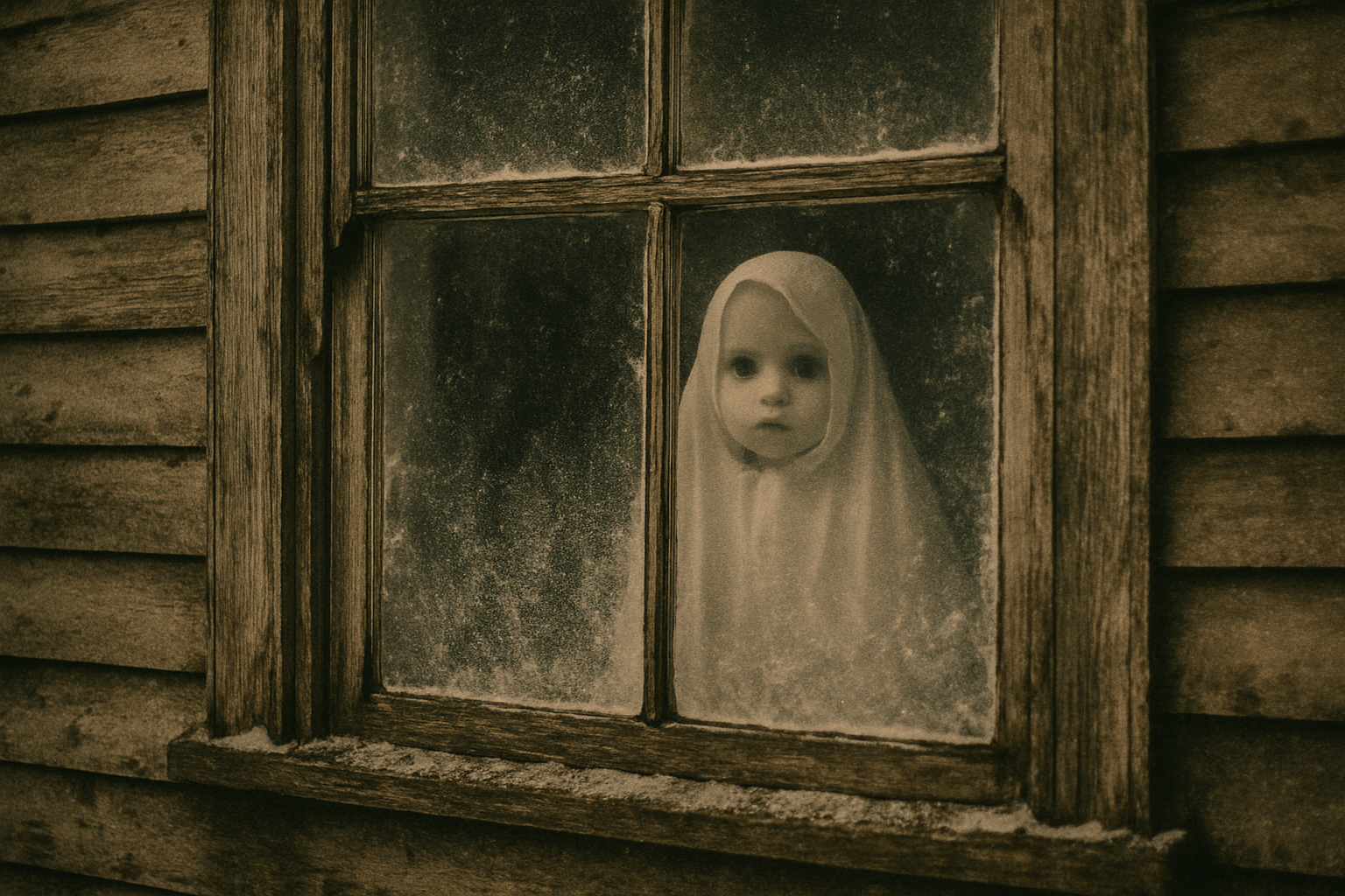 The image features an old wooden window frame through which a doll dressed in a white sheet can be seen. She appears frozen in place, attentively gazing at the surrounding world. The window glass is slightly foggy and dirty, adding an atmosphere of mystery and nostalgia to the scene. The wooden boards of the house, located to the right, look worn and timeworn. The lighting is soft, creating a warm yet simultaneously mysterious ambiance.