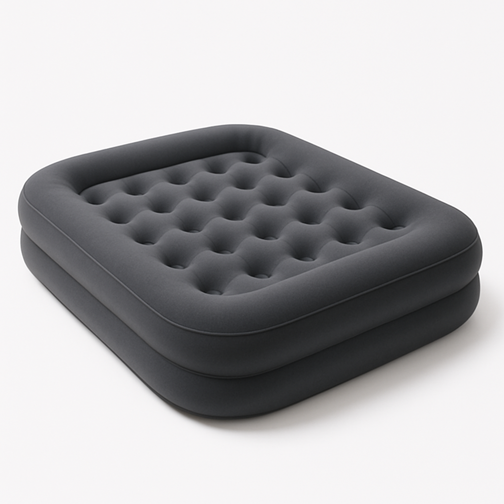 The image features a square-shaped gray inflatable mattress. It is made of high-quality material that ensures durability and comfort. The surface of the mattress has characteristic buttons, giving it a stylish and modern look. The dimensions of the mattress allow it to be used both indoors and outdoors, making it a versatile item for relaxation.