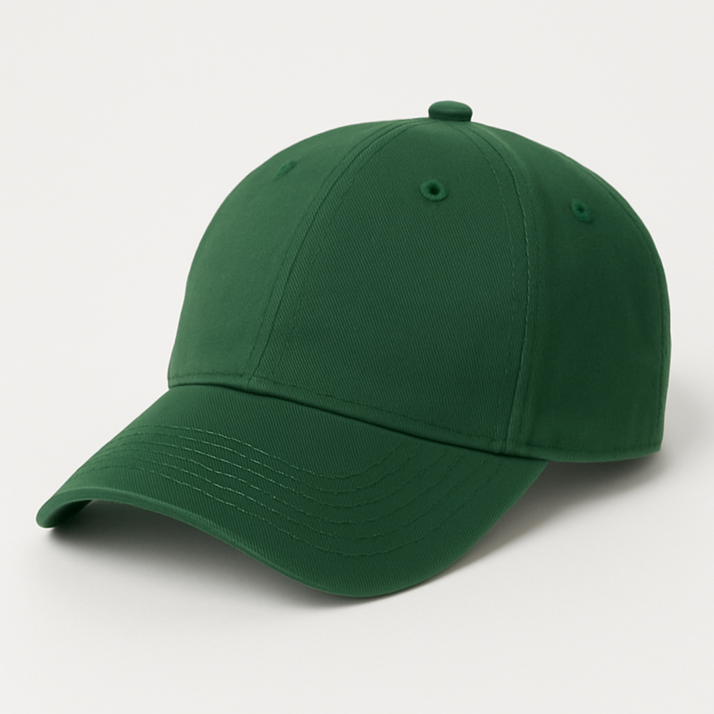 The image features a green cap with a visor. The cap is made of textile material and has a classic shape suitable for various styles of clothing. The visor of the cap is curved, providing ample protection from sunlight. Ventilation holes are located at the top of the cap, promoting air circulation and making it more comfortable to wear. The cap's color is a rich, bright green, allowing it to stand out among other accessories. It is suitable for both walks and outdoor activities.