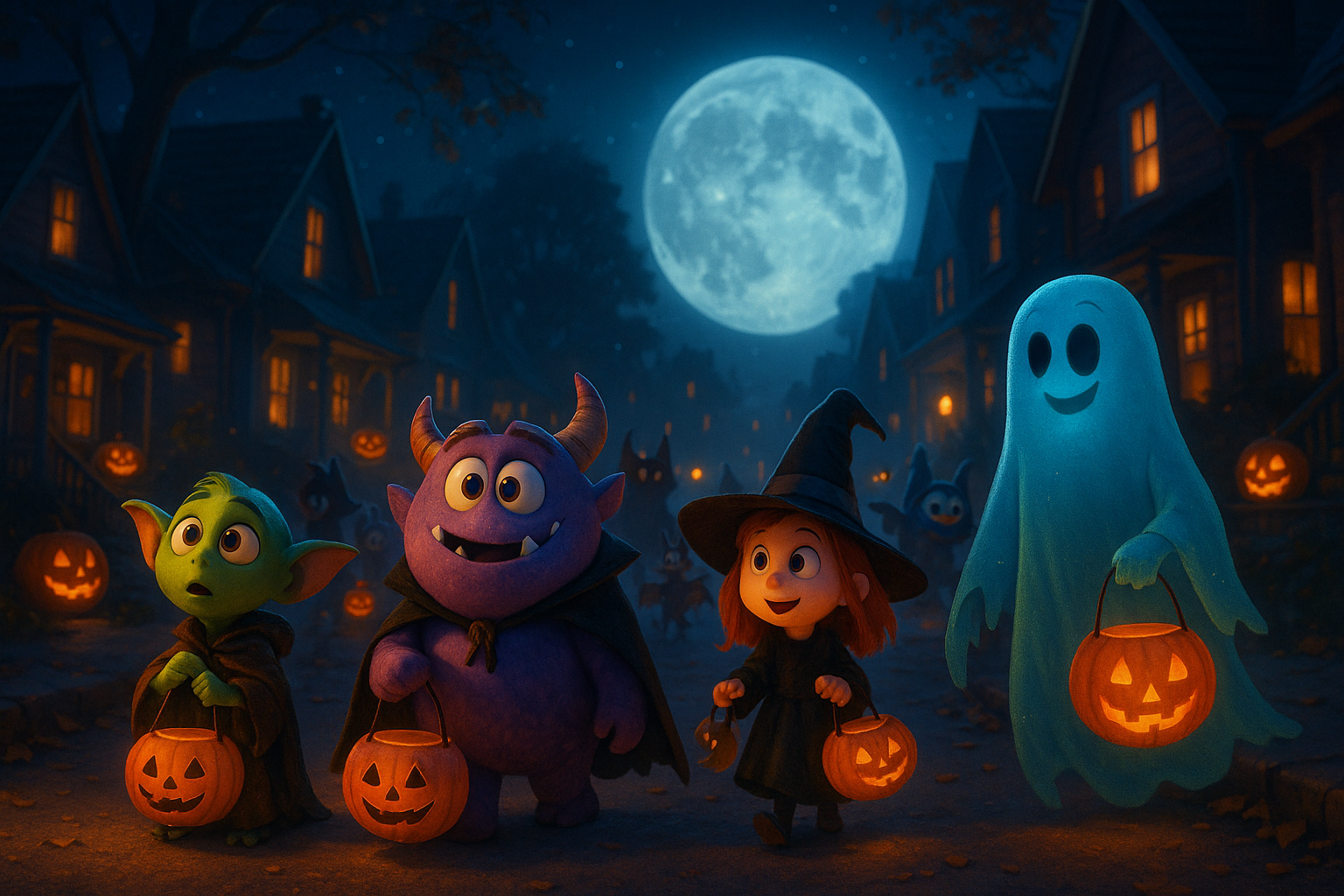 This image can be used in various materials related to Halloween, including advertising campaigns, children's books, party decorations, animated films or series. It can also serve as inspiration for creating themed events related to Halloween, such as parties or quests for children. The image is excellent for social media aimed at entertainment and the overall festive mood as kids prepare for Trick or Treat.