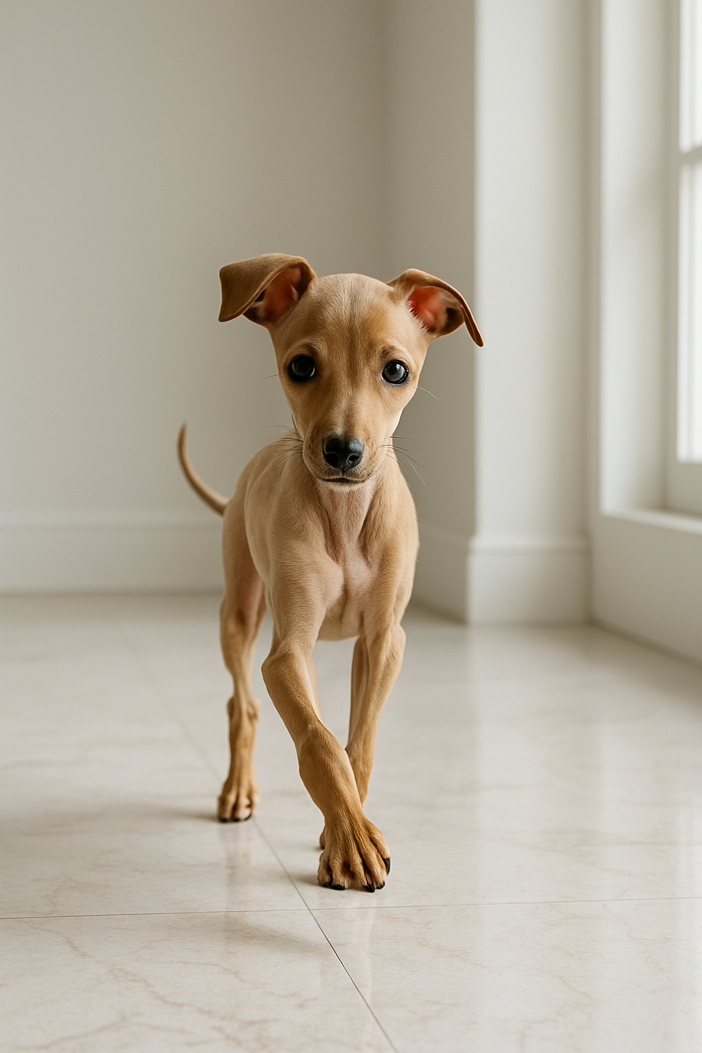 The image features an Iguana breed puppy confidently walking on a light floor in a spacious room. The puppy has short, smooth fur of a light brown color with some small spots. Its large eyes attract attention with their expressiveness and curiosity. It has a slim figure with long legs, giving it an elegant appearance. The background is entirely neutral — light-colored walls and plenty of natural light streaming through the windows create an atmosphere of home comfort and tranquility. This moment perfectly captures the youth, playfulness, and good mood of the puppy exploring its new environment.