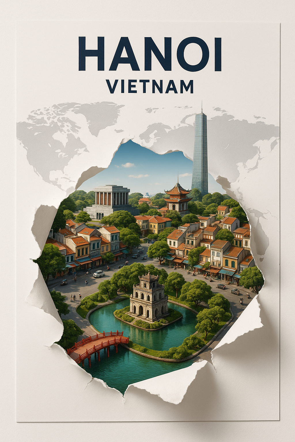 The image presents a picturesque panorama of Hanoi, the capital of Vietnam. The main element of the picture is the famous Bridge Tower with its surroundings— a green park and a water body, at the center of which is the historical Pagoda on the water. Nearby, ancient buildings and cozy streets with red roofs create an atmosphere of fidelity to traditions. In the background, a modern skyscraper looms, symbolizing the city's development, while a world map highlights the global significance of Hanoi as a tourist destination. This image perfectly conveys the combination of historical and modern aspects of the Vietnamese city.