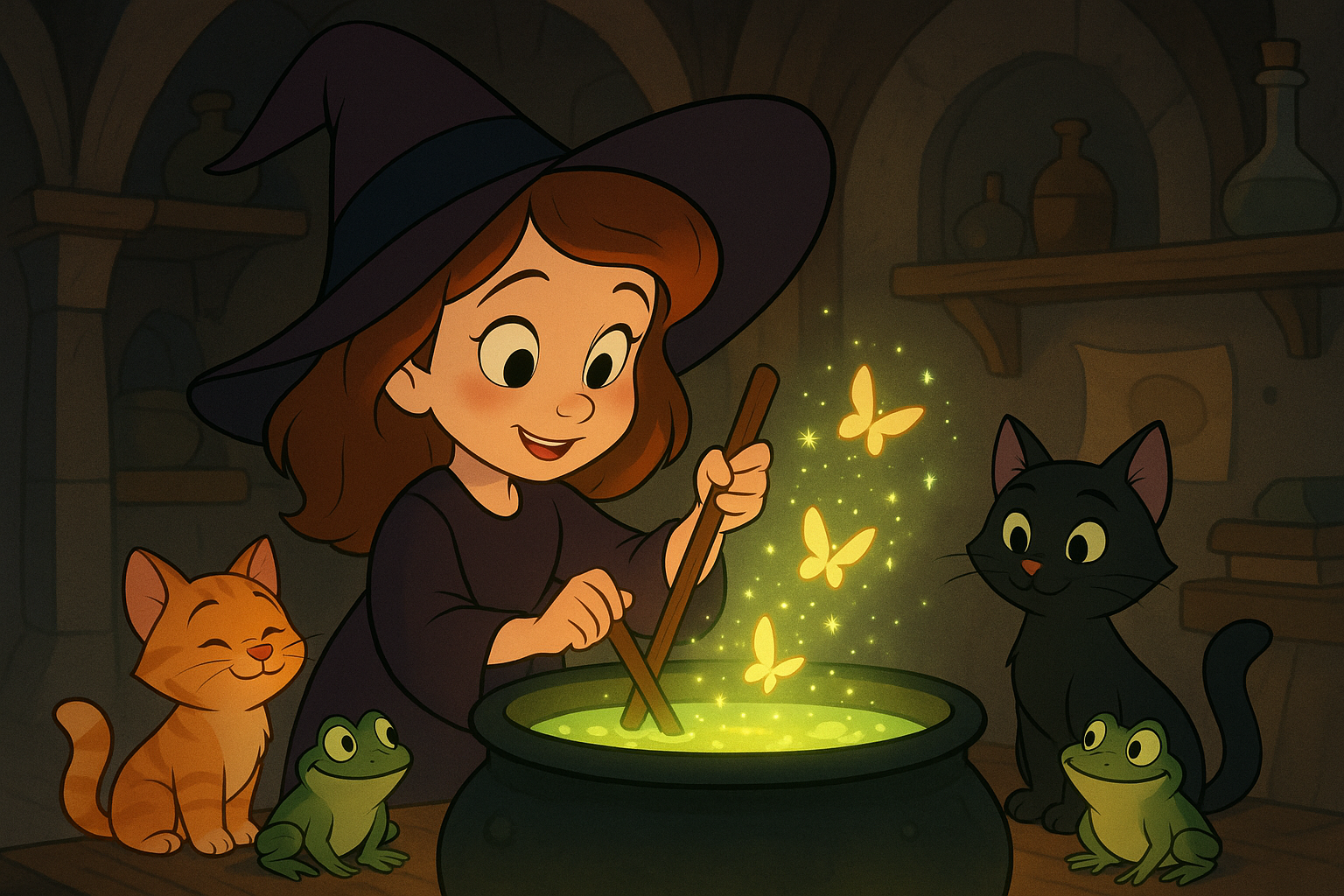The image shows a little girl in a witch's hat happily brewing a potion in a large cauldron. She is using a wooden stick to stir the bright green liquid that emits glowing butterflies and sparkles. Next to her are her loyal friends: a black cat with a curious look, an orange kitten with a content expression, and a green frog watching the process. The atmosphere of the depicted scene is filled with magic and joy, creating a sense of coziness and lightness.