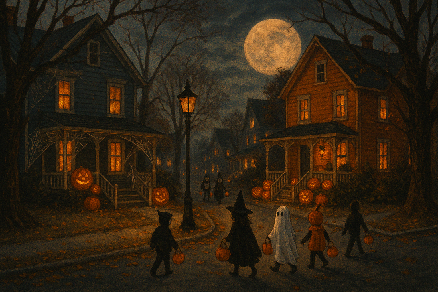 The image depicts a mysterious Halloween night in a small town. A bright moon shines on the dark sky, reflecting its light in the windows of houses surrounded by trees. Children in costumes of witches and ghosts stroll through the streets, holding glowing pumpkins that emit an orange light. The houses are decorated in traditional Halloween style, adorned with arrangements of pumpkins and cobwebs.