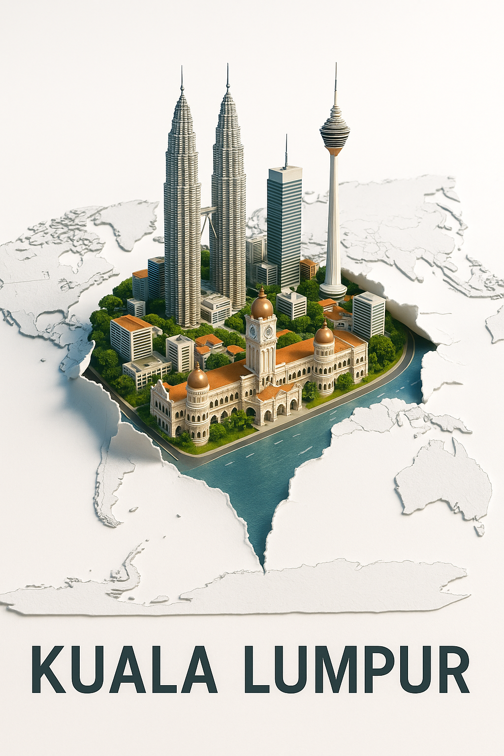 The image showcases a miniature model of Kuala Lumpur's main attractions, including the famous Petronas Towers and other modern buildings. They are set against a white map background, highlighting the geographical identity of Malaysia's capital. The model is surrounded by green vegetation, adding picturesque elements and contrasting with the architecture. At the bottom of the image, a river is displayed, emphasizing the natural surroundings and aesthetics of the city. Modern buildings and historical architecture coexist in one space, symbolizing the harmony between tradition and modernity.