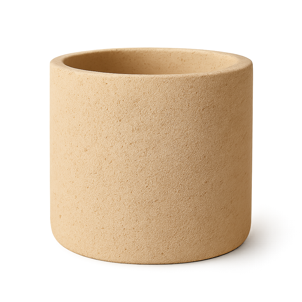 The image features a modern round flower pot made of ceramic. Its color is light beige, and the surface has a matte texture, giving the product a stylish and sophisticated look. The pot has straight lines and a simple shape, characteristic of minimalist design. The diameter of the top of the pot is larger than that of the bottom, allowing for easy placement of various plant compositions. This pot will easily fit into any interior, whether at home or in the office.