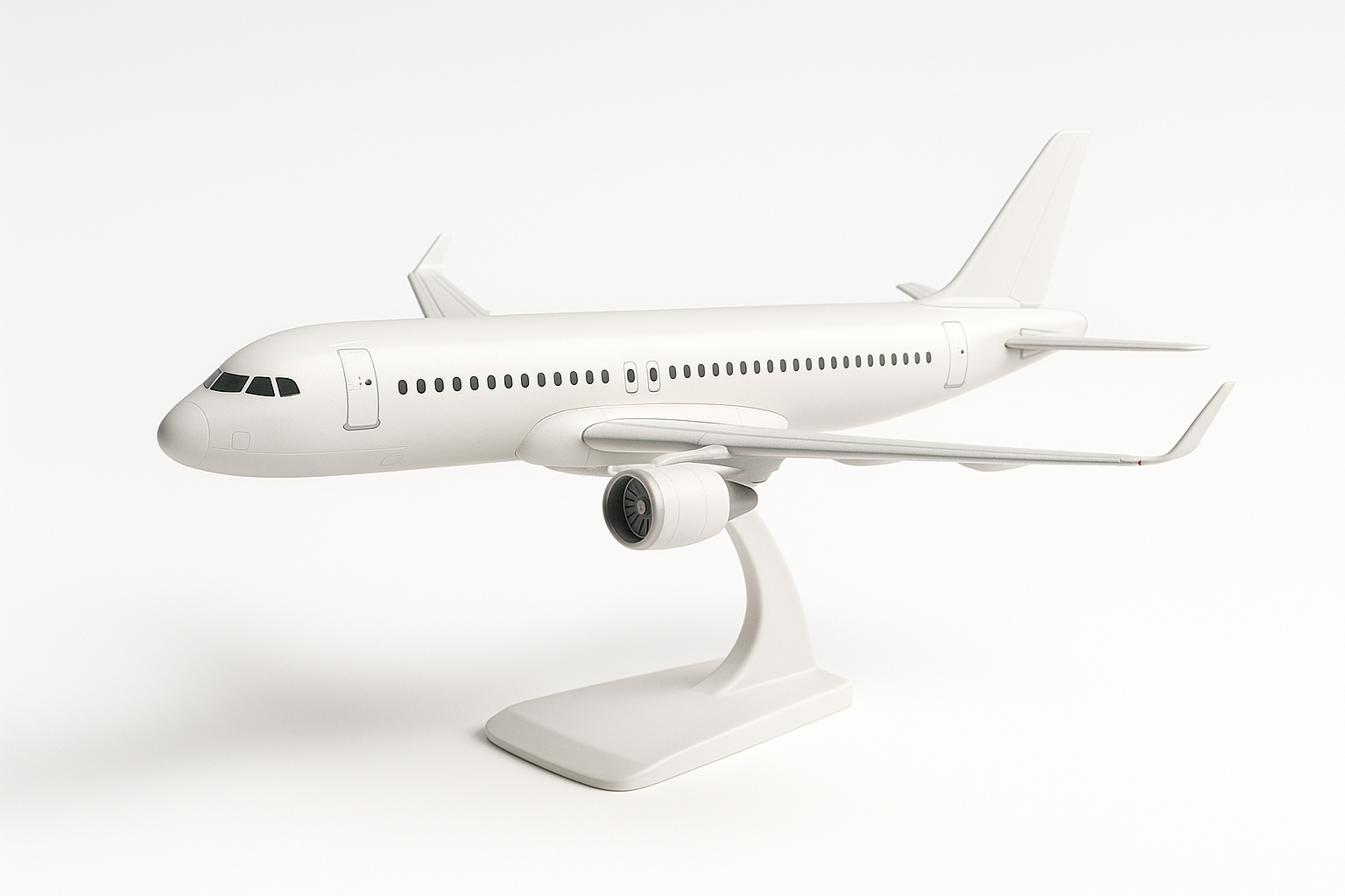 The image shows a scale model of an airplane, made in white. The model is depicted on a white background, creating an effect of lightness and minimalism. The details of the construction, including windows and wings, are clearly visible from the front. The model's propellers are placed on a stand, emphasizing its shape and aesthetics. This model may be of interest to aviation enthusiasts, collectors, and those seeking an original decor element for their space.