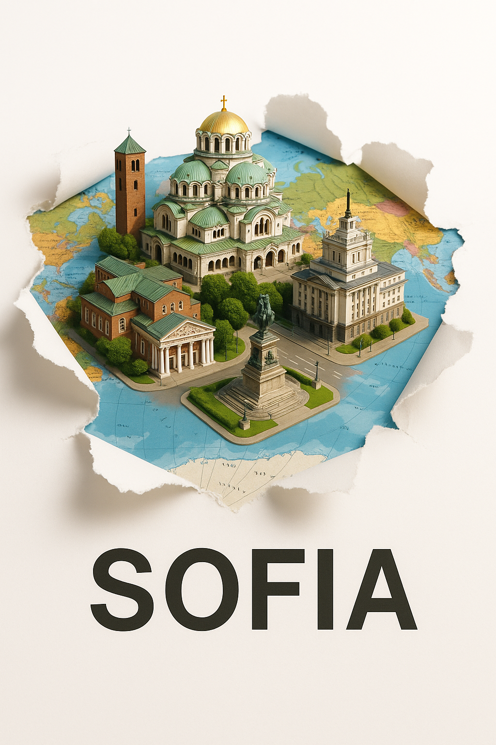 The image presents a model of the city of Sofia, placed on the map of Europe. This model includes famous architectural landmarks, such as Saint Alexander Nevsky Cathedral, as well as other buildings that characterize the cultural heritage of Bulgaria's capital. All elements are rendered with incredible detail—from the colors of the rooftops to the features of the facades. Additionally, the map serves as a background, showing the geographical context of Sofia's location and highlighting its significance as a cultural and historical center.