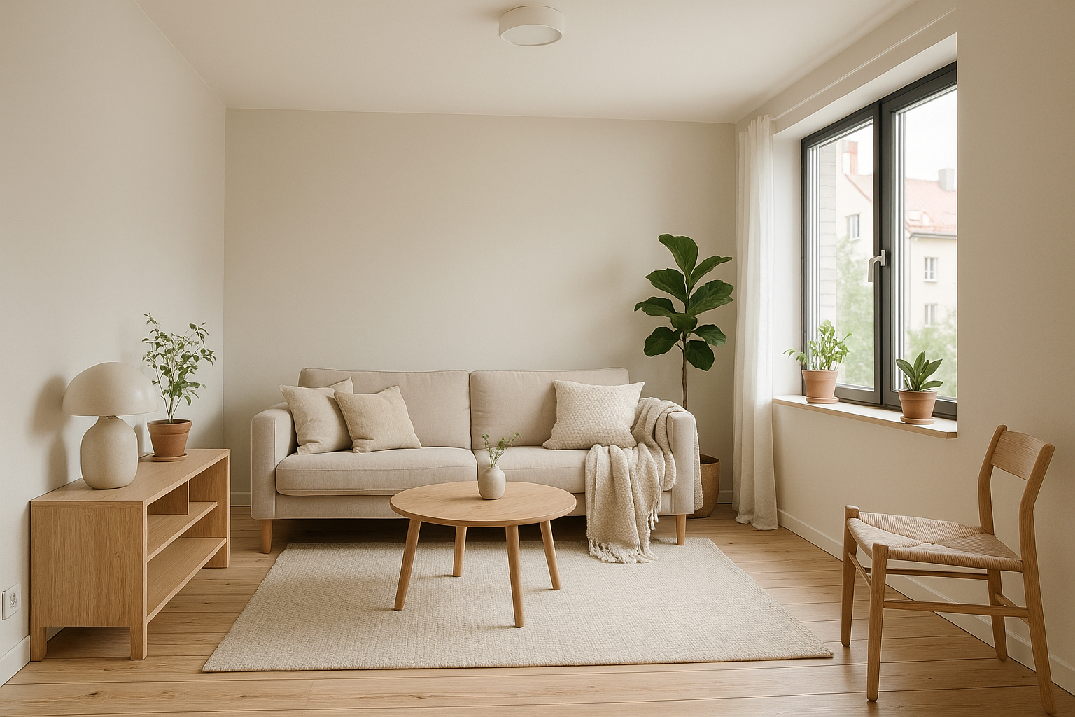 The image features a bright and modern living room decorated in neutral tones. The focal point is a comfortable cream-colored sofa adorned with numerous cushions. Next to the sofa is a low wooden table with rounded shapes. Opposite the sofa stands a light wooden chair with a woven seat. On the table, there's a vase containing a small plant, and by the window, dressed with light curtains, there are two planters with green plants. The light wooden floors add warmth and coziness to the overall interior, creating a harmonious atmosphere.