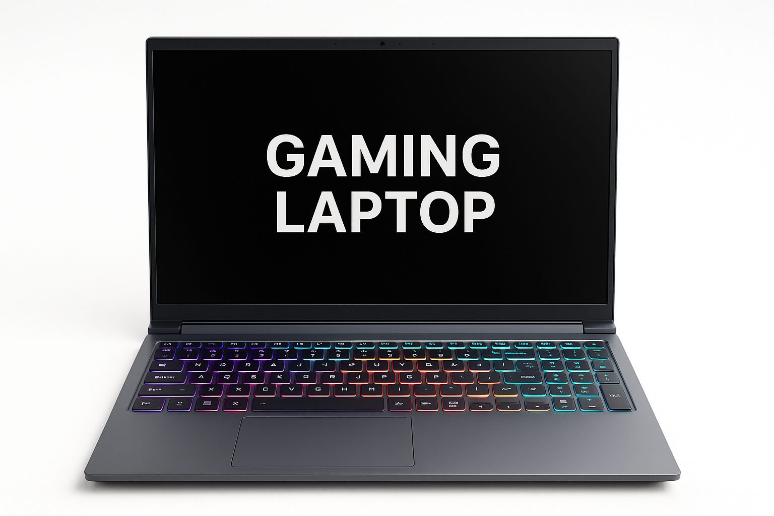 The image shows a modern gaming laptop that stands out with its stylish design and vibrant RGB keyboard backlight. The screen displays the text 'GAMING LAPTOP', emphasizing its purpose. The laptop features a slim body and minimalist style, making it convenient for portability and use in various settings. The keyboard is equipped with multicolored backlighting, giving the device a high-tech appearance and creating an atmosphere for gamers. The black background of the screen allows for focus on the bright graphics.
