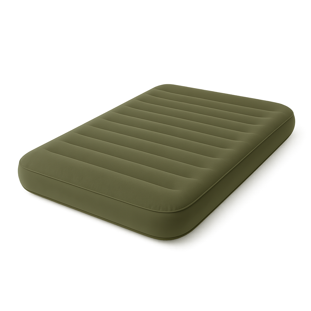 The image shows a modern inflatable mattress in a stylish green color. It has a flat surface with characteristic ribs, providing comfortable conditions for sleep and relaxation. The mattress is perfect for both outdoor use and home use. The surface of the mattress is resistant to stains and easy to clean, making it easy to keep in good condition.