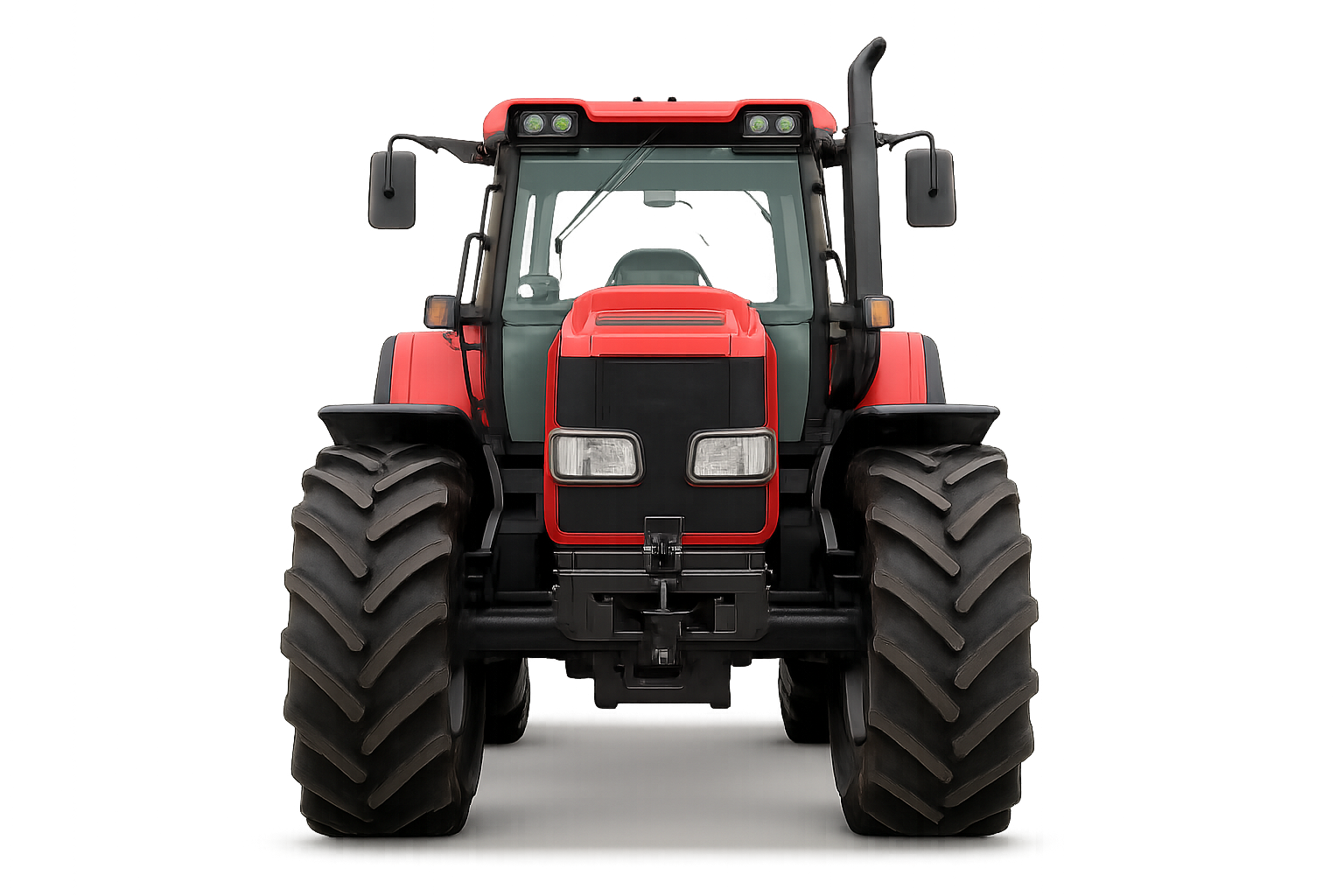 The image features a modern tractor painted in a bright red color. It has massive tires typical of agricultural machinery, ensuring excellent traction with the ground. The tractor looks powerful and imposing, with sharp lines and a contemporary design. Two large LED headlights are positioned on the front panel, allowing the tractor to be used in any conditions, including at night. The driver's cabin, with transparent windows, provides a good view of the surrounding area, and various control elements can be seen next to it, enabling effective management of the machine. The black background of the image highlights the tractor, making it the central element of the composition.