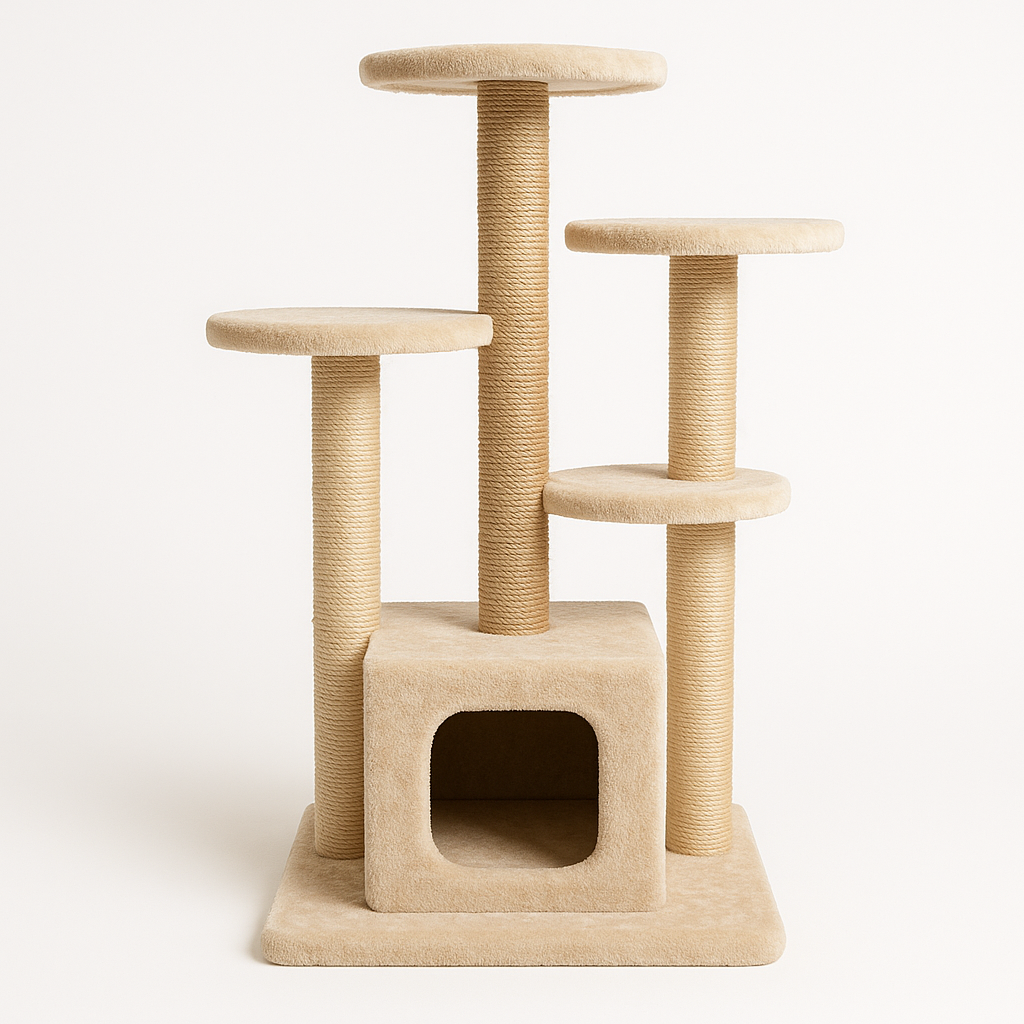 The image features a cat house in neutral shades. It is equipped with multiple levels, making it an ideal place for indoor cats to play and rest. A sturdy base and smooth surfaces ensure safety during active play. The main elements of the design are four posts wrapped in sisal, allowing cats to easily sharpen their claws. The upper platforms are perfect for observing the surroundings.