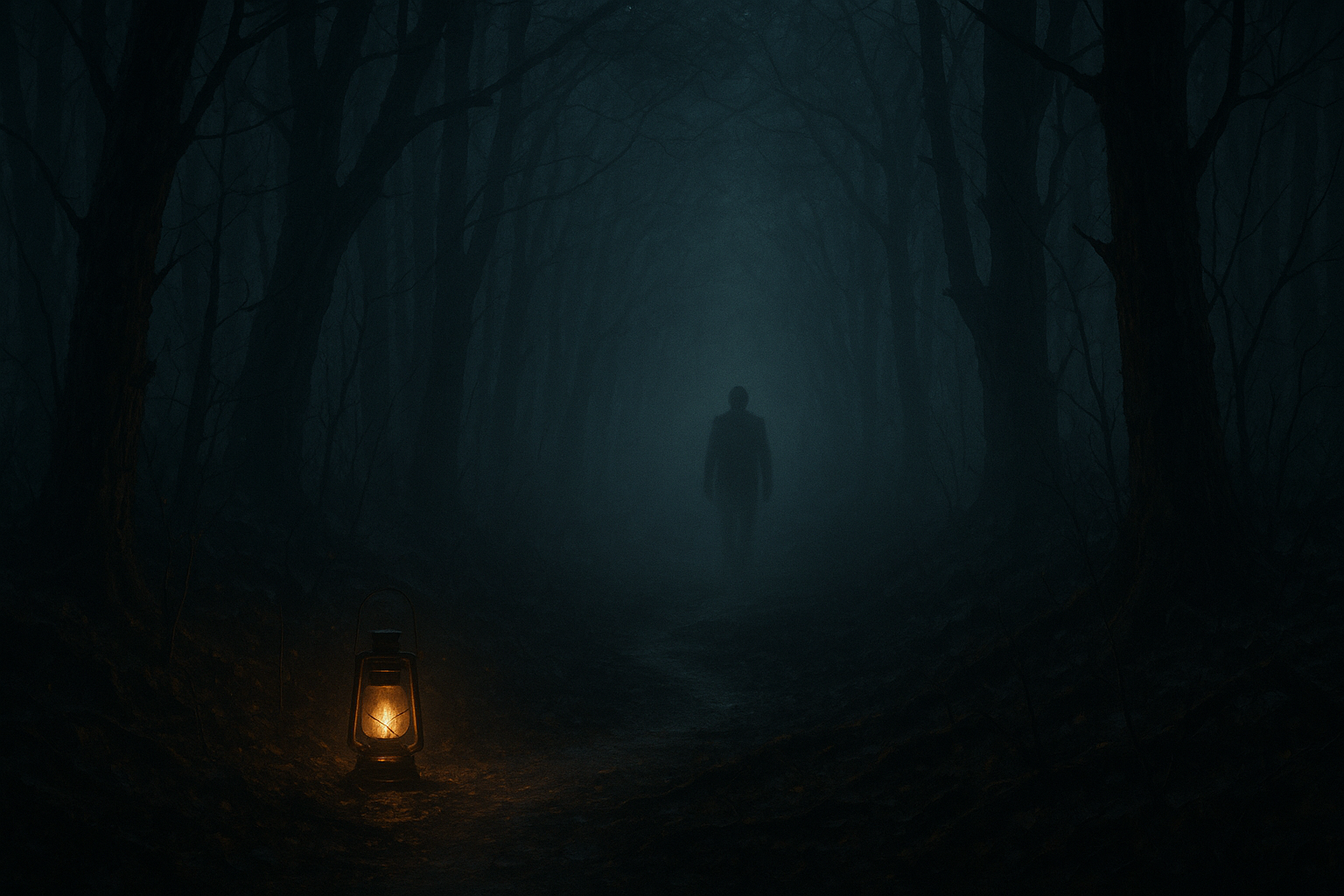 The image depicts a mysterious forest shrouded in thick fog, creating an atmosphere of intrigue and uncertainty. Along the winding path to the left, an old lantern glows with warm light. In the distance, the silhouette of a person slowly walks along the path. The trunks of the trees are enveloped in a soft mist, making their outlines hazy and enigmatic. The lantern, with its bright flame, is the only source of light in this ominous place, giving the entire scene a sense of the supernatural.