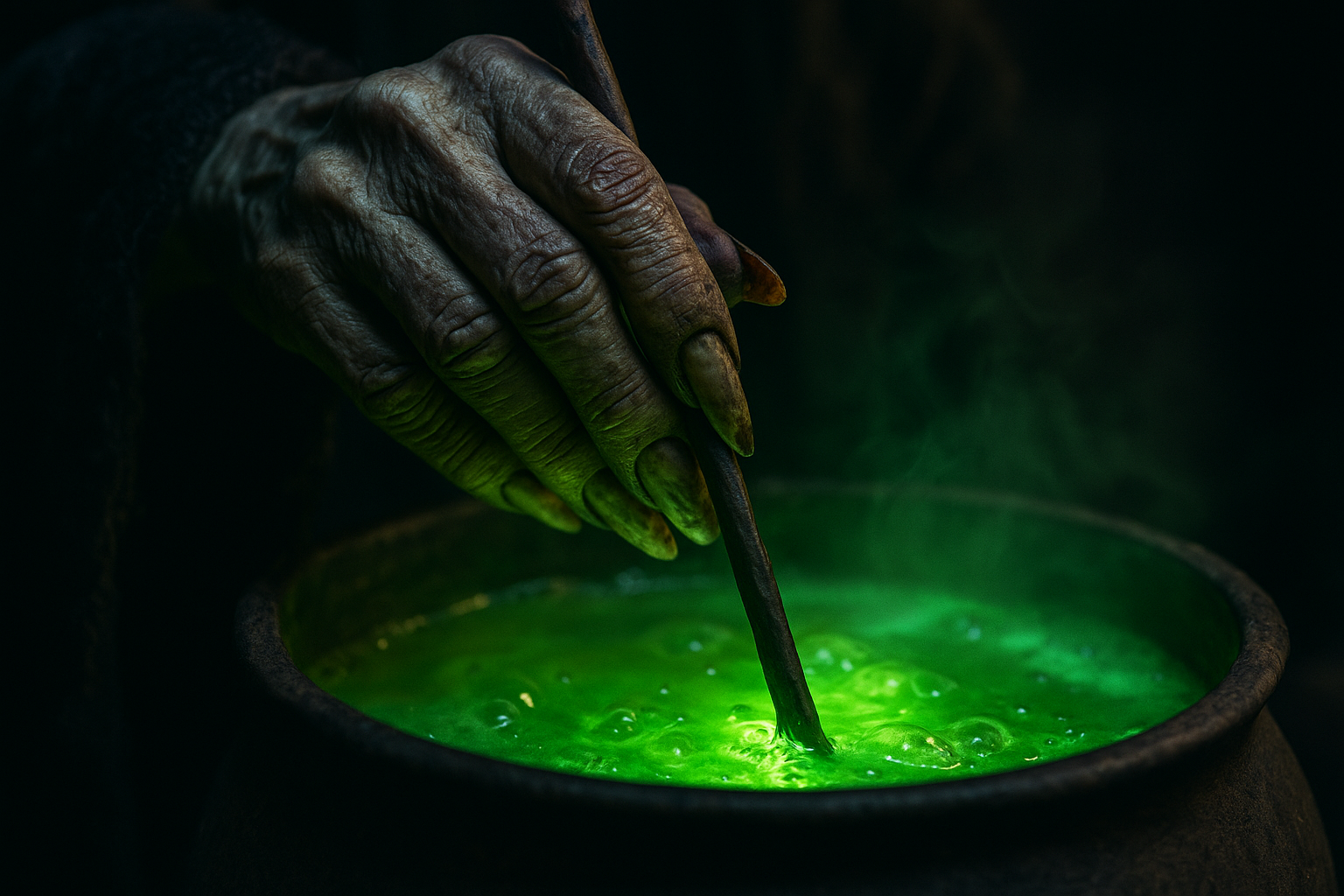 The image shows a hand with often wrinkled skin and long, pointed nails stirring bright green liquid in a cauldron. This potion is surrounded by a light cloud of steam, creating a mystical atmosphere. The dark background emphasizes the mystery and secrecy of the process.