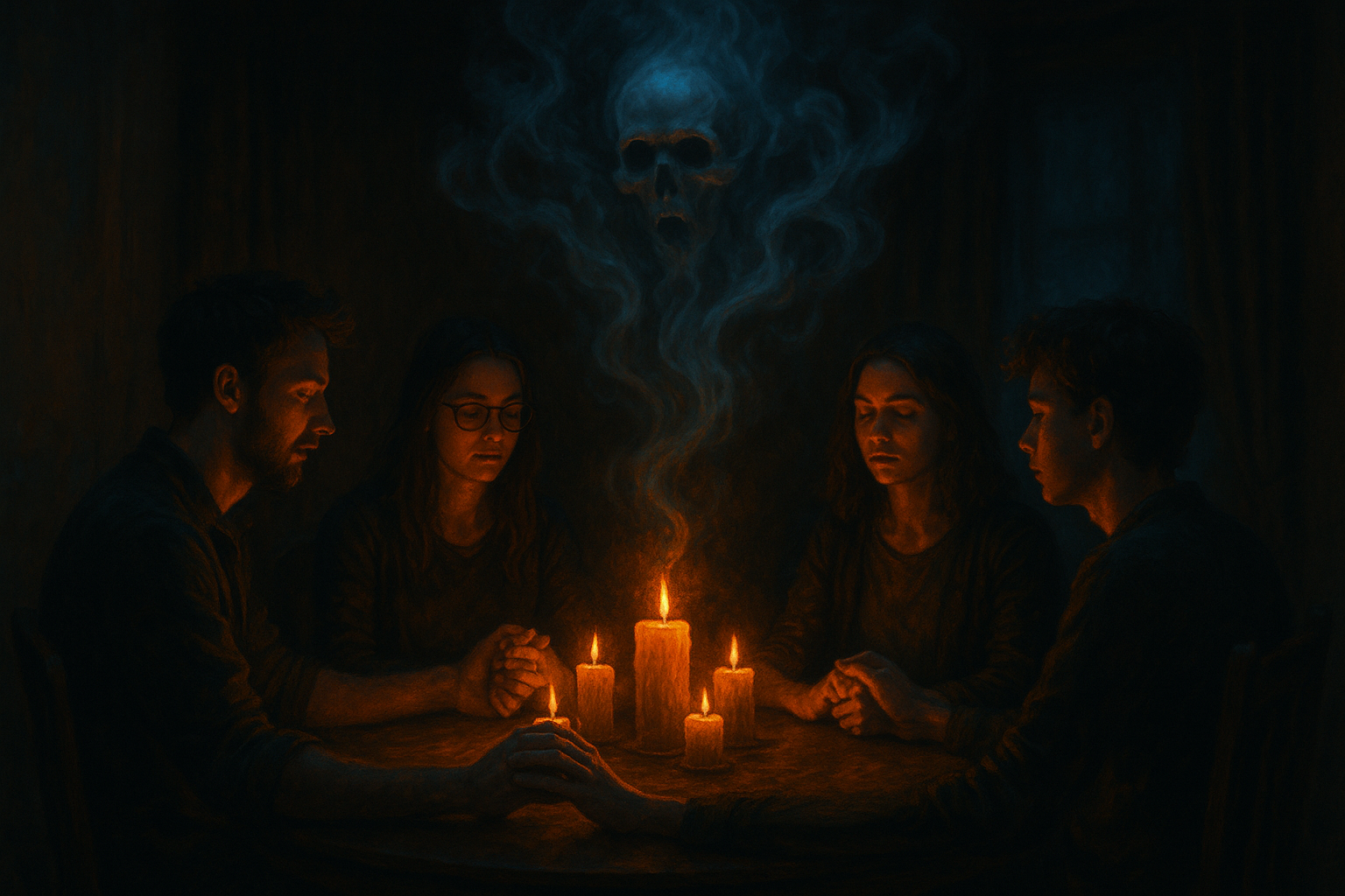 The image depicts a mystical scene where a group of people gathers around a table illuminated by the soft glow of burning candles. The shadows from the candles create an enigmatic atmosphere, highlighting the faces of each participant. To the left of the table sits a man with short hair, who is intently looking ahead, and next to him is a woman in glasses, lost in her thoughts. Opposite them are two women, one of whom appears contemplative, while the other, with long hair, gazes at the glowing candles. Above the table hovers a mysterious ghost in the shape of a skull, surrounded by wisps of smoke, adding a haunting and eerie tone to the scene.