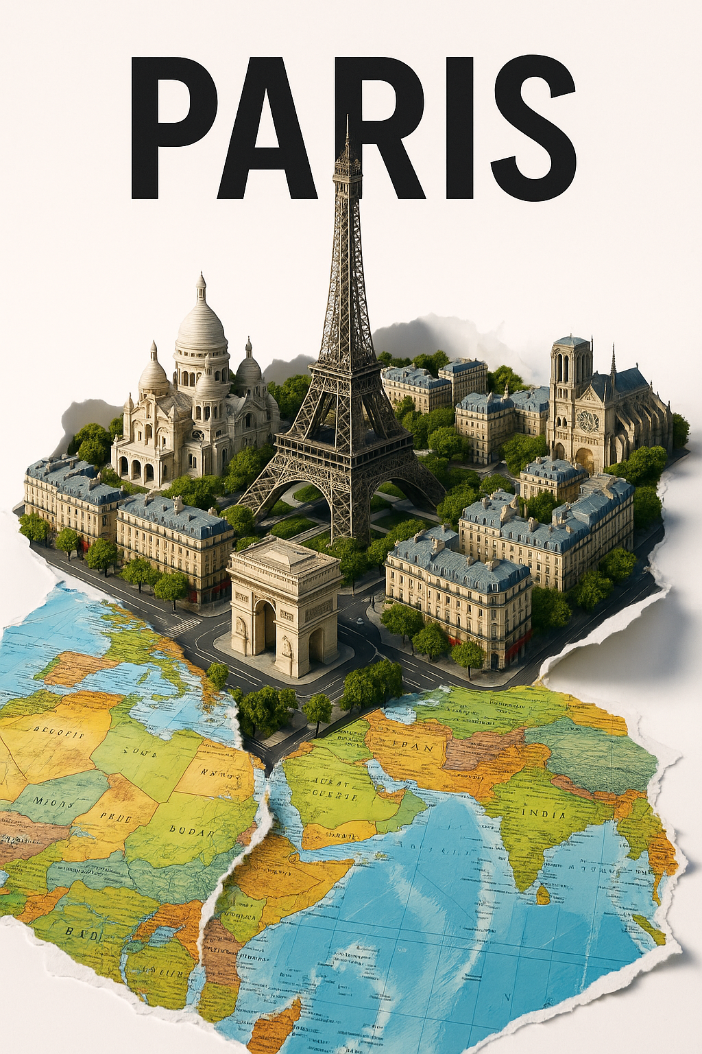 The image features a three-dimensional model of the capital of France — Paris. Major landmarks such as the Eiffel Tower, Sacré-Cœur Cathedral, Notre-Dame, and the Arc de Triomphe are carefully arranged against a backdrop of a world map. The map is depicted in vibrant colors, showing the outlines of various countries and continents. The combination of architectural elements and the map creates a unique atmosphere, highlighting the cultural values and global significance of Paris as a tourist destination.