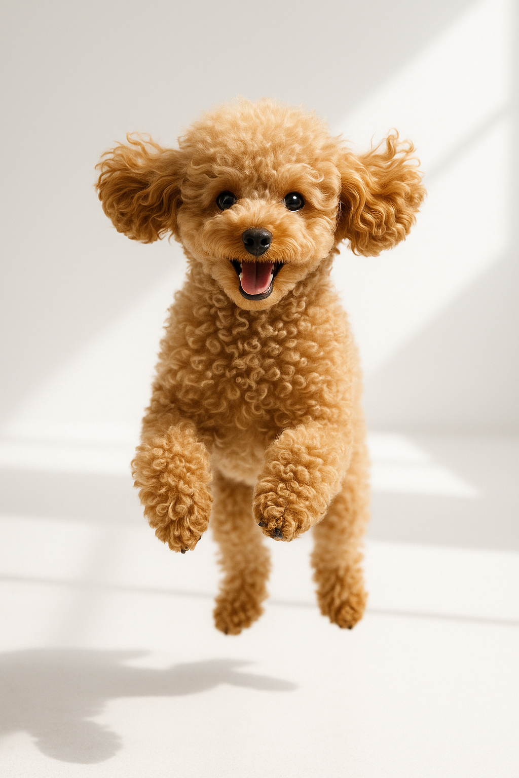 The image captures a playful and energetic poodle jumping against a neutral white background. Its curly golden coat accentuates its expressive features: large black eyes and a wide, cheeky mouth displaying sharp teeth. The poodle looks extremely satisfied and joyful, making its image particularly appealing. Light falls from one side, creating interesting shadows and highlighting the texture of the dog's fur.