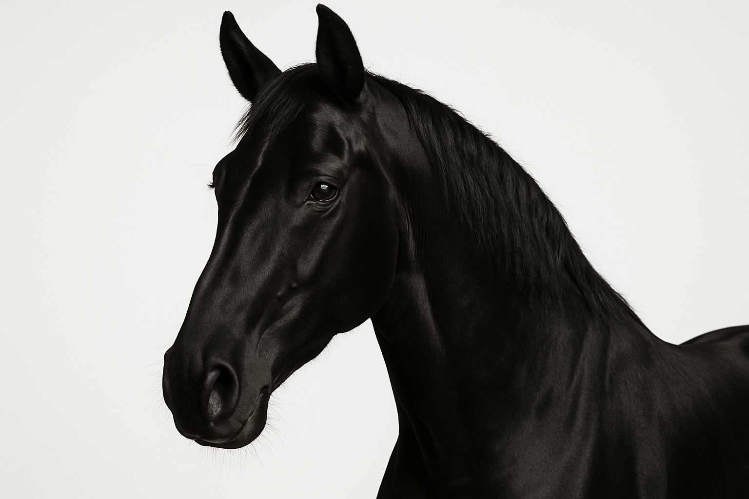The image features a close-up of a black horse with a smooth coat and well-defined facial features. The horse is positioned against a light neutral background, highlighting its elegance and grace. Deep eye sockets and detailed lines on the muzzle add individuality and character to this animal. The appearance of the black horse embodies strength and grace, making it an ideal subject for photography and design.