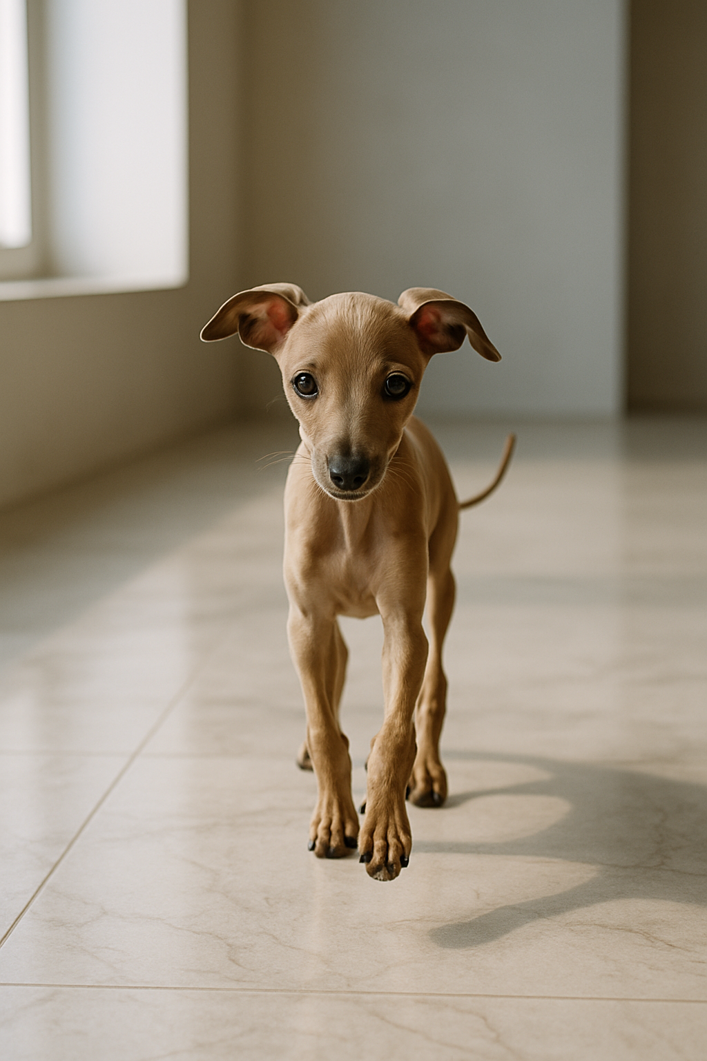 The image features a puppy of the Italian Greyhound breed. The puppy has short beige fur and large, expressive eyes. It stands on a light tiled floor in a room with windows that let in natural light. The background of the image is done in soft shades, creating a calm atmosphere. The puppy looks curious and playful as it gazes attentively at the camera, emphasizing its friendly nature.