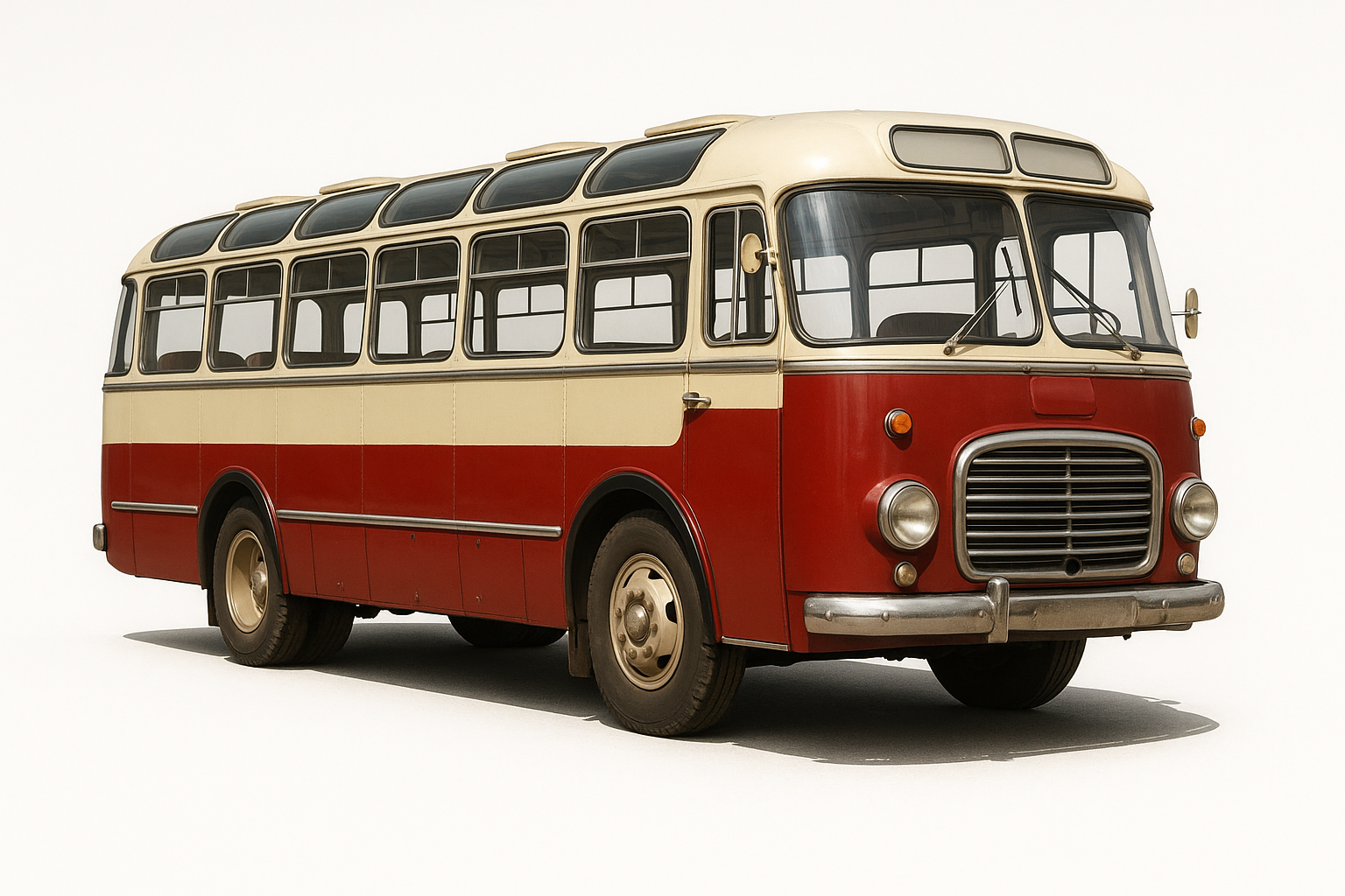 The image features a retro bus designed in the characteristic style of the mid-20th century. The bus has a two-tone color scheme: a red lower half and a cream upper half, which is a classic combination for that era. The bus model likely dates back to the 1960s when such vehicles were widely seen on the streets of cities.