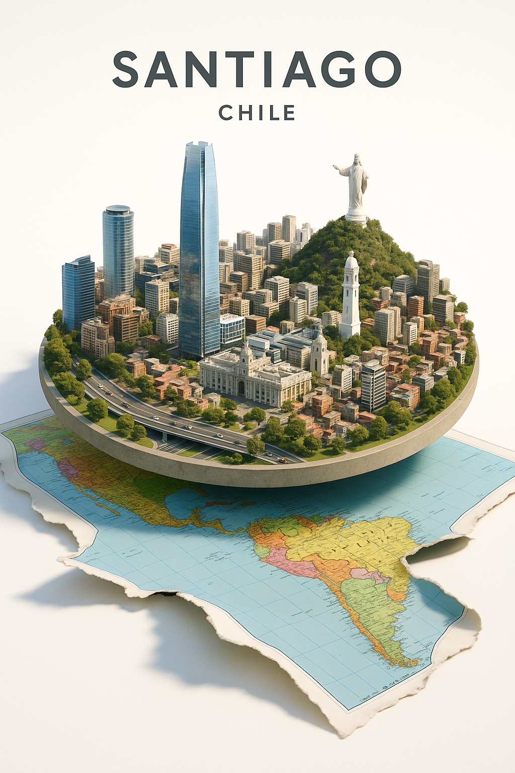 The image features a stylized model of Santiago, the capital of Chile, set against a backdrop of a map of South America.