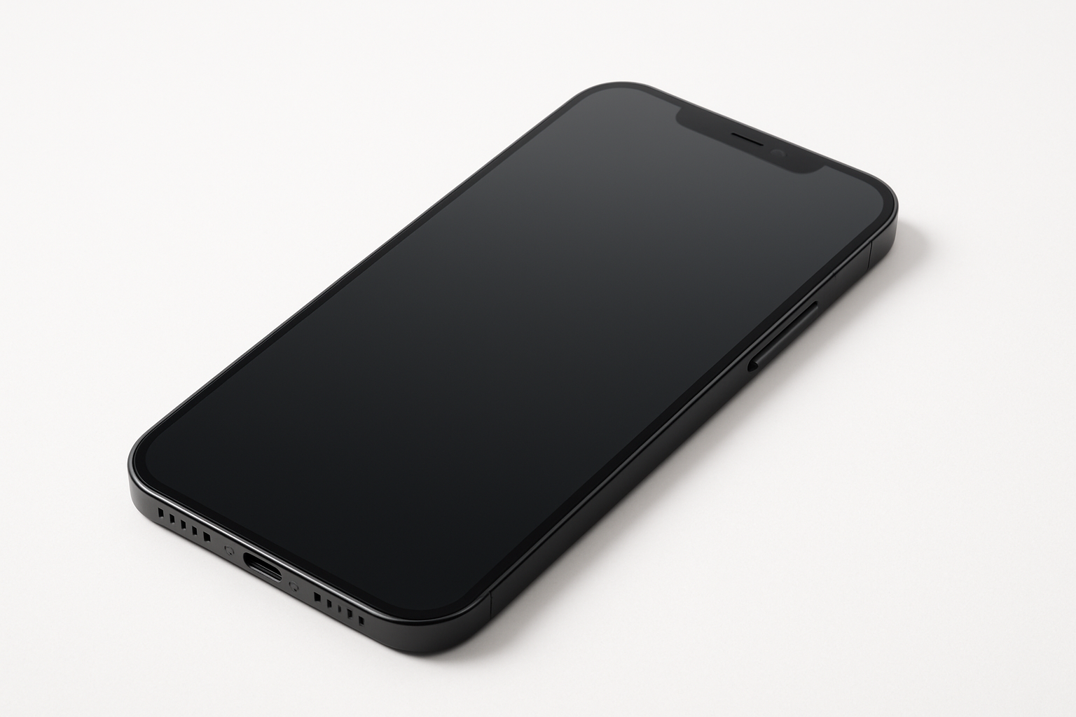 The image features a modern black smartphone lying on a white neutral background. The device's screen is dark and devoid of any displayed elements, creating a minimalist and clean perception. The smartphone has rounded corners, and the body appears to be made of glossy material, giving it a stylish look. The bottom of the device shows a charging port and speakers, which also emphasize the modern design. Unlike bright color schemes, this image highlights the elegance and sophistication of the specific model, focusing on its shape and texture.
