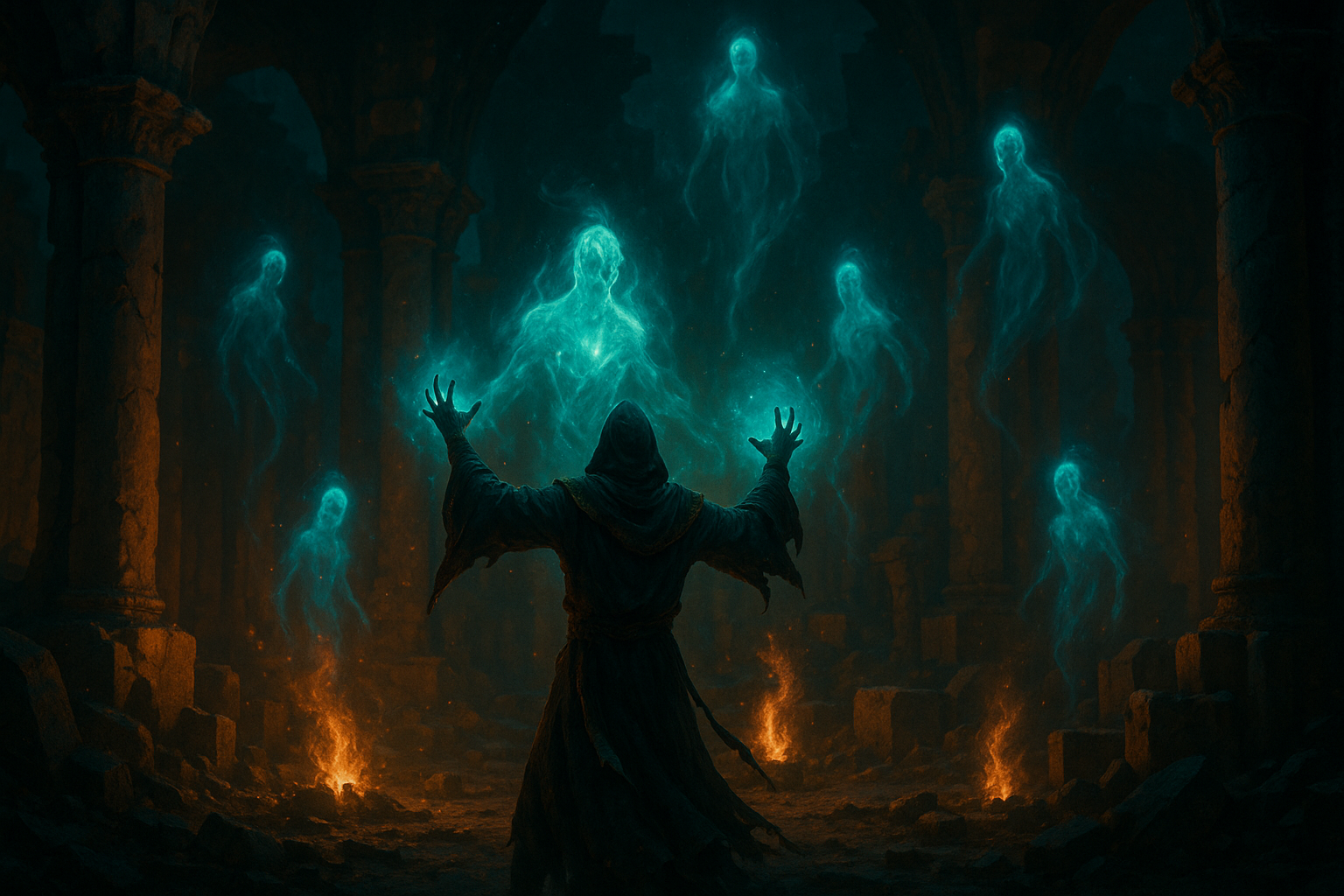 The image depicts a dark underground hall where a mystical ritual is taking place. The central figure is a person in a long dark robe, standing with their back to the viewer. Their hands are raised, seemingly calling forth spirits. Surrounding them are translucent blue figures, likely spirits. The floor of the hall is made of stones, and small tongues of flame can be seen in several places, contrasting with the darkness of the room. Arched columns and rather rough architecture add a sense of ancient mystery.