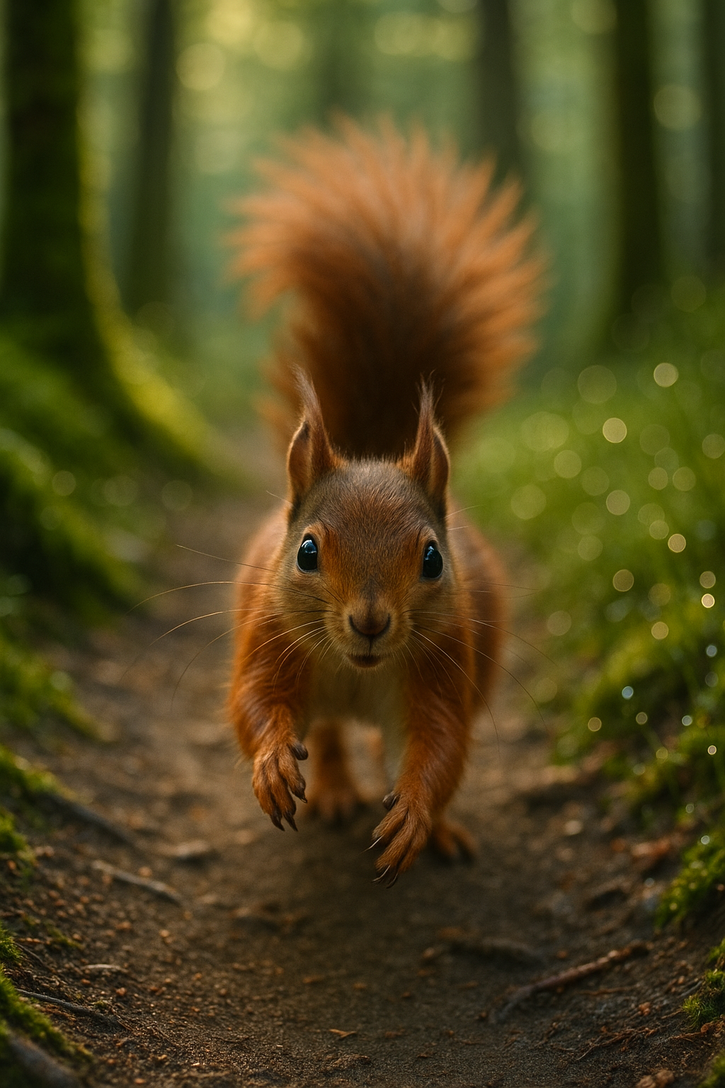 The image captures a squirrel seemingly jumping along a forest path surrounded by green moss and trees. The morning light creates a soft glow, highlighting the details of the animal's fur and the various shades of green around. The squirrel has large expressive eyes that draw attention, and its fluffy tail is dynamically raised above its back. The path it is running on is slightly worn, indicating frequent use. Occasionally blurred droplets of dew on the ground add a sense of freshness to the morning time.