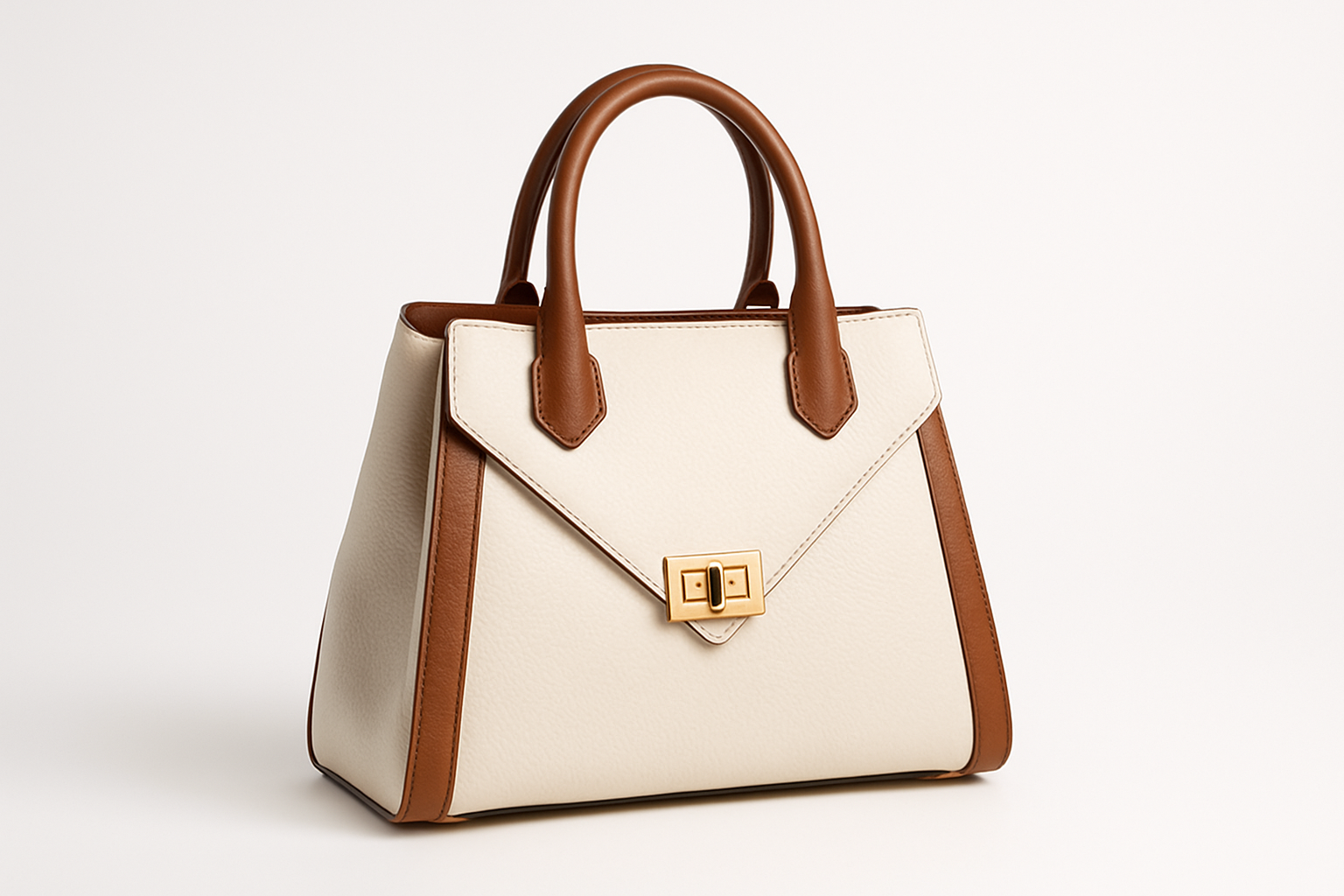 The image features an elegant women's handbag, made in a light color with brown leather handles. The bag has a rectangular shape with sharp corners, giving it a modern look. A small gold buckle adorns the closure on the front, adding an element of luxury. The bag is suitable for both everyday wear and more formal events. Its minimalist and stylish design makes it a versatile accessory that can be paired with various outfits.