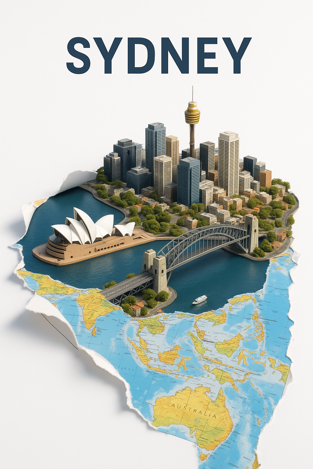 The image features a 3D model of the city of Sydney set against a stylized map of Australia. At the center of the composition stands the iconic Opera House with its distinctive sails, alongside the Harbour Bridge connecting the two shores. The tall buildings of the business district create a modern urban landscape, while green spaces provide a sense of nature and comfort. All of this is set against a historic map, highlighting Sydney's geographical significance as the largest city in Australia.